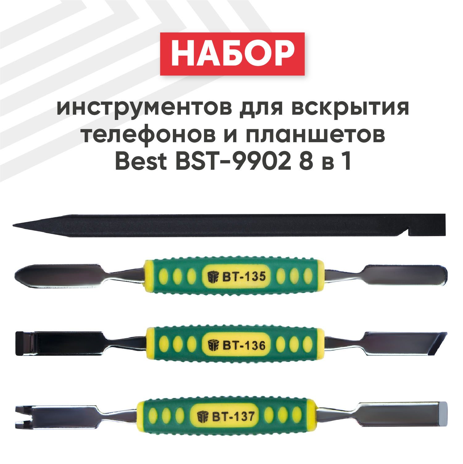 Лучшие цены. Набор инструментов для вскрытия телефонов и планшетов Best BST-9902 8 в 1Набор инструментов BEST BST-9902 для ремонта телефонов и ноутбуков, 8 в 1 для ремонта мобильной техники и электроники. Состав набора: Лопатки: 5 шт; Медиатор: 2 шт; Присоска. Магазины в вашем городе.