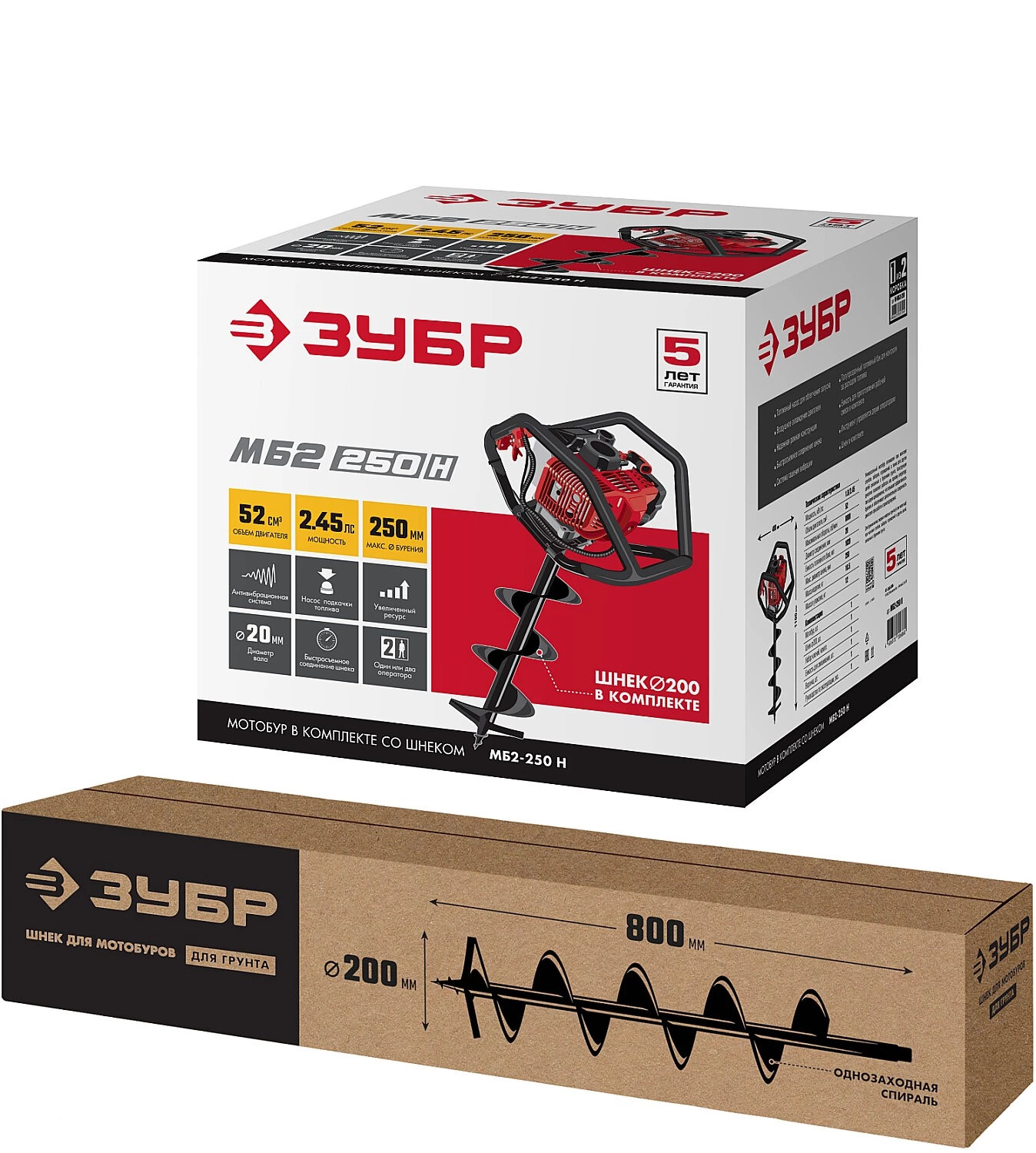 Зубр Мотобур со шнеком, d=60-250 мм, 52 см3, 2 оператора, МБ2-250 Н