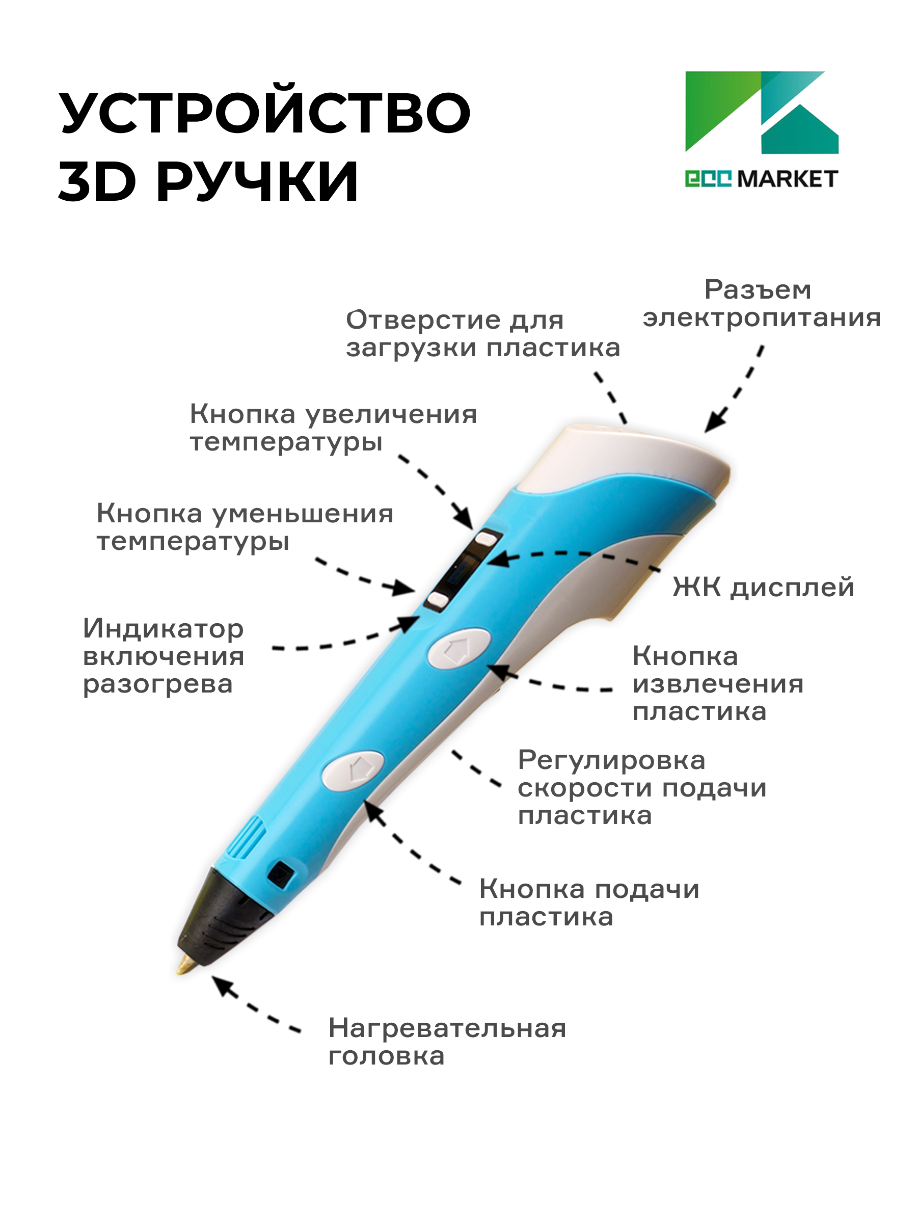 3D ручка ECC Market 3D Pen 2 с набором дополнительного пластика "радуга" и трафаретами голубой