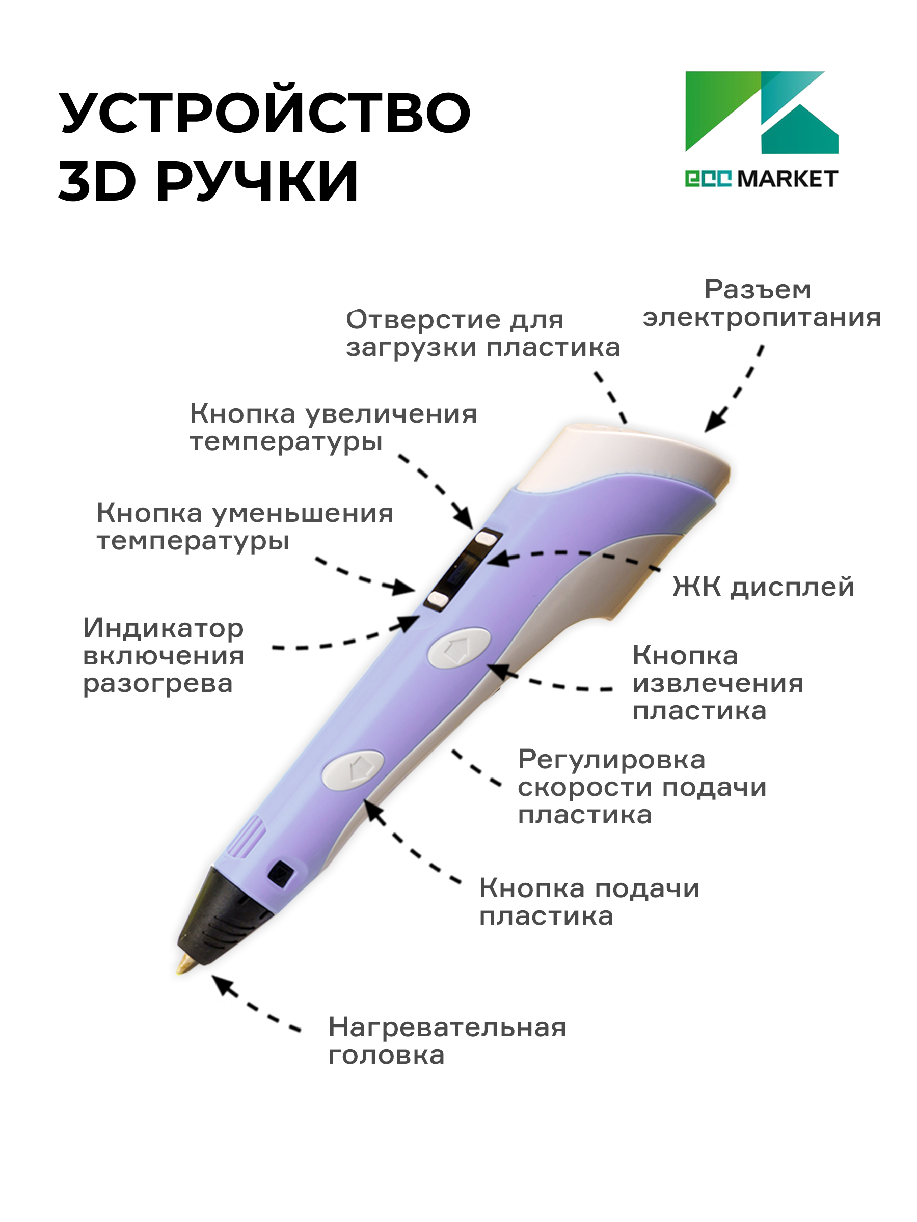 3D ручка ECC Market 3D Pen 2 с набором дополнительного пластика "радуга" и трафаретами фиолетовый