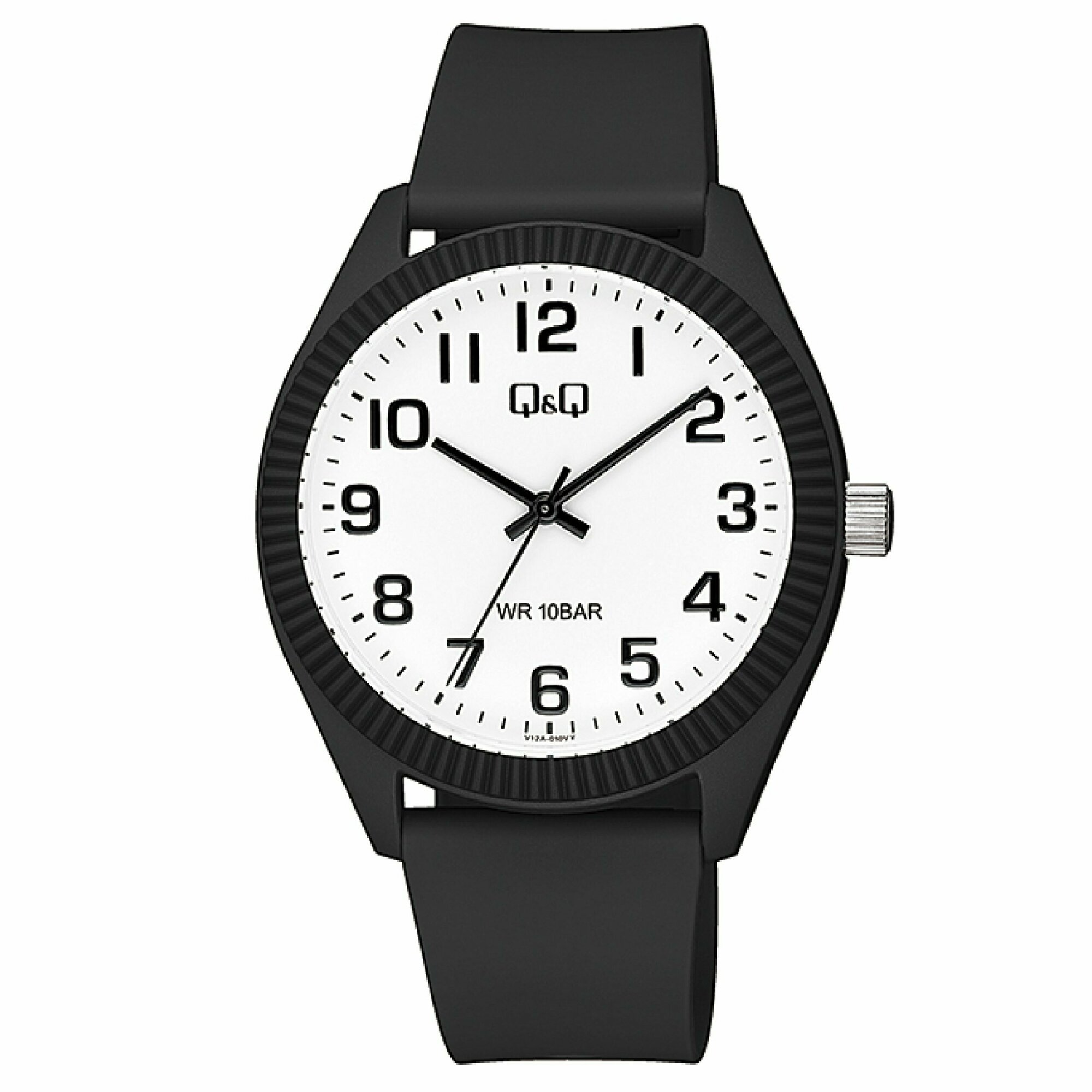 Лучшие цены. Мужские японские наручные часы Q&Q V12A-010 [V12A J010Y]. Кварцевый механизм в высокой точностью +/-20 сек в месяц. Прочное, устойчивое к царапинам, минеральное стекло обеспечит защиту часов от повреждений. Высокая водонепроницаемость 100WR (10 Бар) идеально подходит для плавания с маской и трубкой. Корпус часов сделан из высококачественного пластика. Ремешок из натурального полимерного материала с классической застежкой - это стильно, удобно и практично. Источник питания - батарейка. Магазины в вашем городе.