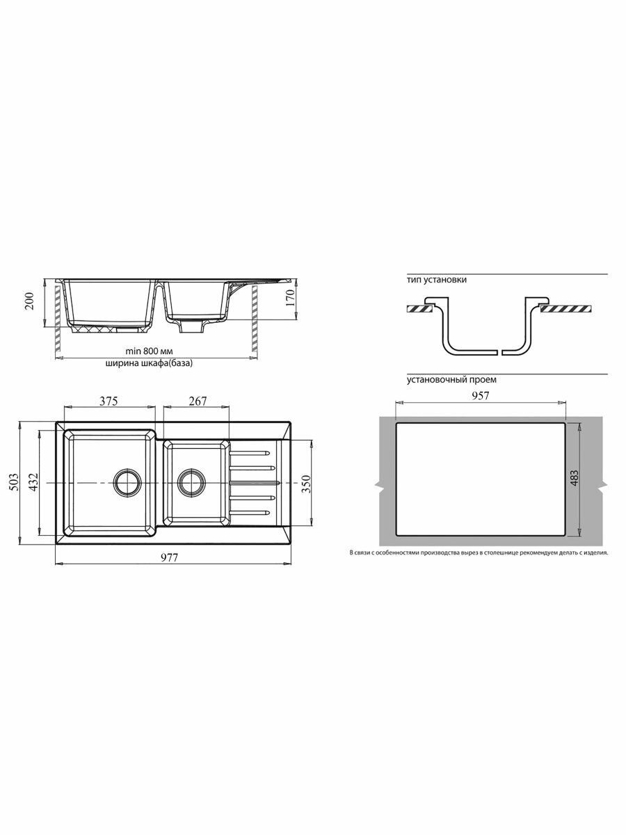 Мойка GRANFEST GF-P980KL 2 чаши+крыло 980х510мм (черный-308)