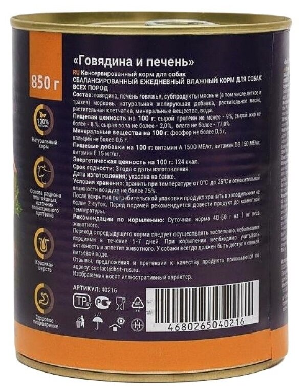 Влажный корм Brit с говядиной-печенью повседневный для собак 850 г