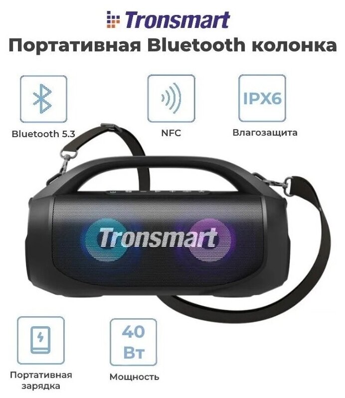 Лучшие цены. Bang SE — компактная версия переносной колонки от популярного производителя акустики Tronsmart с новой подсветкой, подстраивающейся под музыку, двумя динамиками полного диапазона с мощностью 40 Вт и пассивными излучателями для большего выделения низких частот. Как и старшая модель, Bang SE отличается удобным форм-фактором для использования на улице и объемным встроенным аккумулятором на 8000 мАч, который полностью заряжается примерно за 4 часа через разъем USB Type-C и позволяет прослушивать музыку до 15. Магазины в вашем городе.