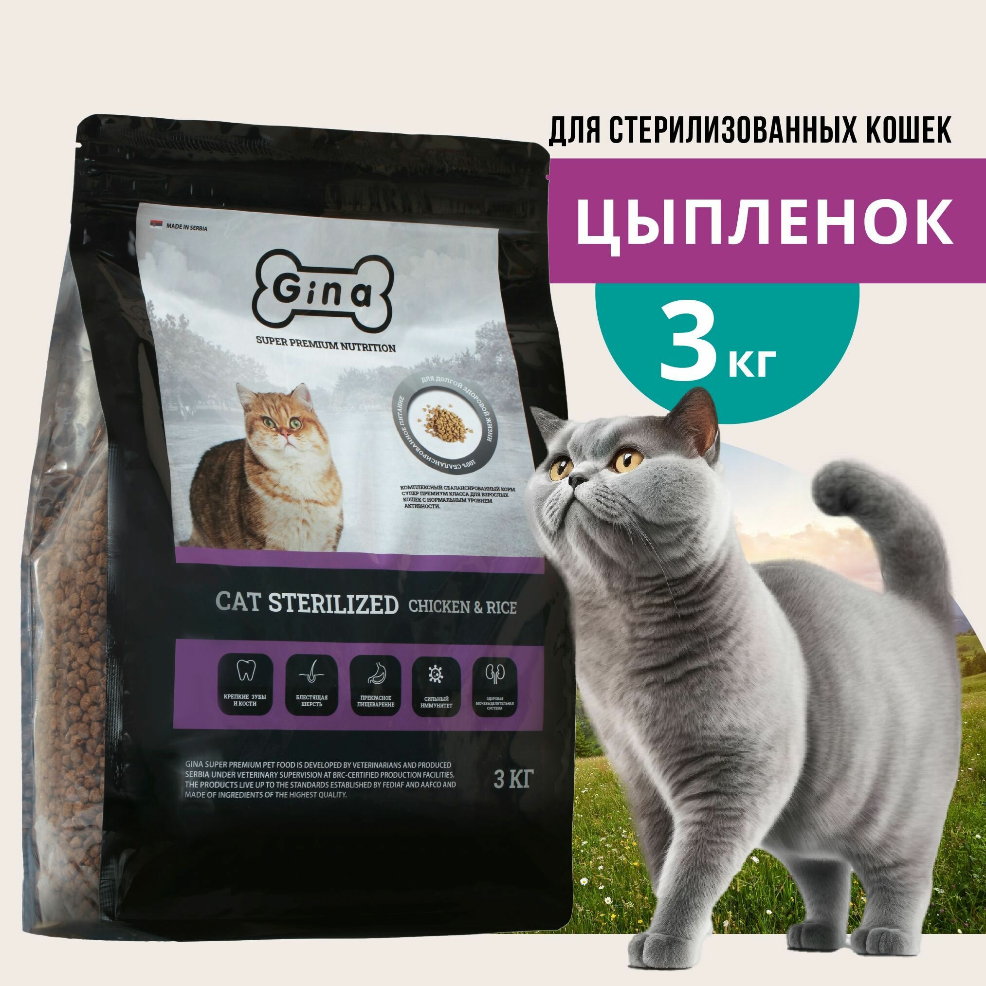Корм сухой Gina Cat Sterilized Chicken & Rice для взрослых стерилизованных кошек с нормальным уровнем активности, Комплексный сбалансированный суперпремиум класса 3 кг