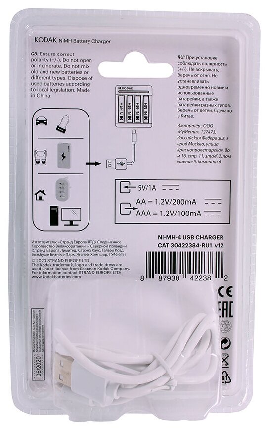 Kodak Зарядное устройство Kodak C8002B, для аккумуляторов 4хAA/AAA, USB, белое