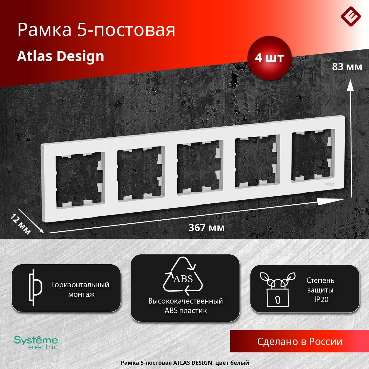 Розетки 4 шт. / Рамка 5 постов Systeme Atlas Design Белый
