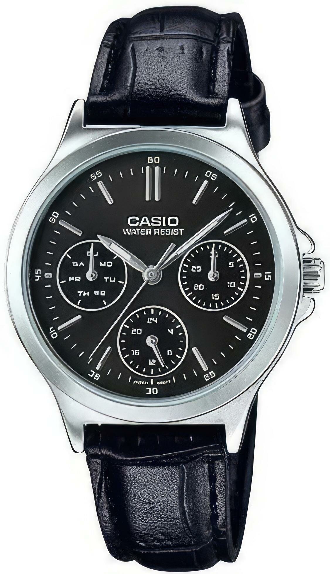 Лучшие цены. Женские наручные часы Casio LTP-V300L-1A кварцевые (батарейка является элементом питания). Корпус стальной с черным циферблатом и минеральным стеклом, защищающим циферблат от ударов и повреждений, браслет - кожаный ремешок. Модель Casio LTP-V300L-1A обладает степенью влагостойкости 50 м (5 АТМ), в этом случае разрешено кратковременное погружение в воду, для плавания рассмотрите модели от 100 м (10 АТМ). Магазины в вашем городе.