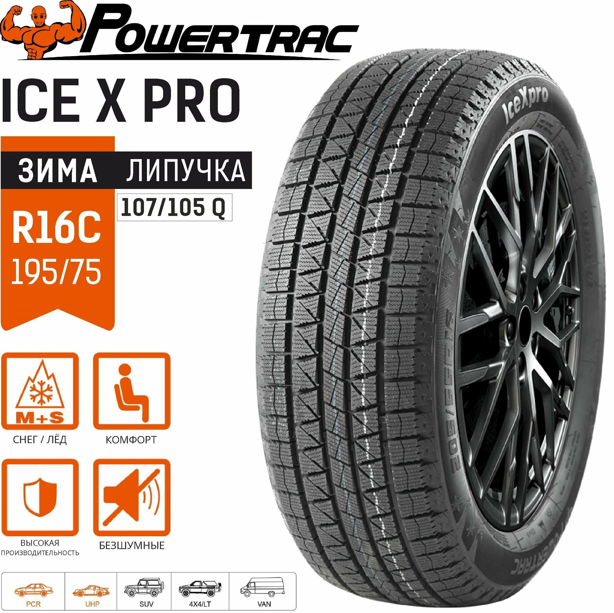 Шины Зимняя шина (Липучка) 195/75 R16C, Powertrac Ice Xpro, 107/105Q, для коммерческого транспорта