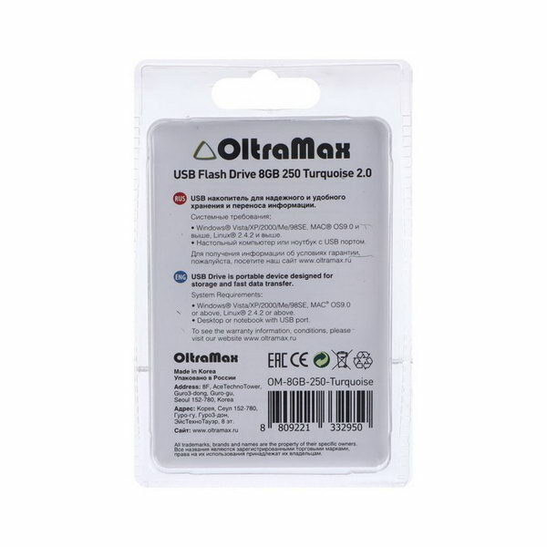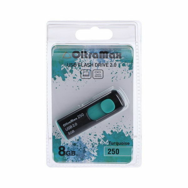 USB-флешки Флешка 250, 8 Гб, USB2.0, чт до 15 Мб/с, зап до 8 Мб/с, бирюзовая