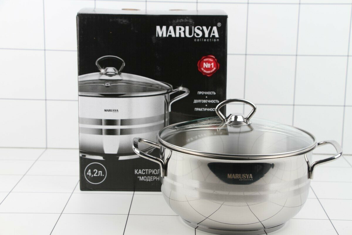 Кастрюли Кастрюля со стеклянной крышкой MARUSYA Модерн из нержавеющей стали для всех видов плит 4,2 л 22 см