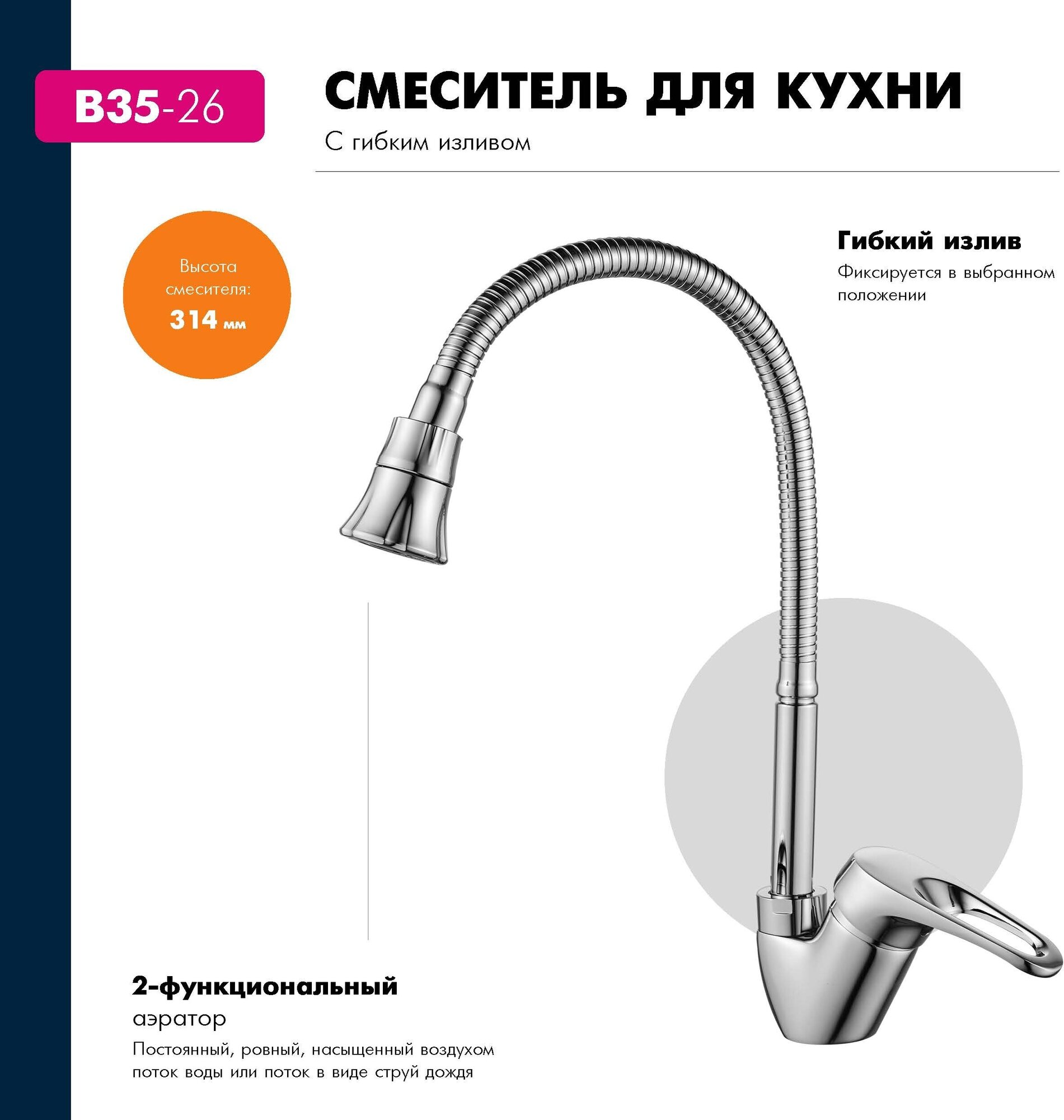 Смеситель Смеситель кухня ROSSINKA картридж д.35мм с гибким изливом 160 мм, B35-26