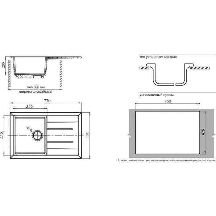 | Размеры врезного отверстия (накладная) | 760x480 мм |