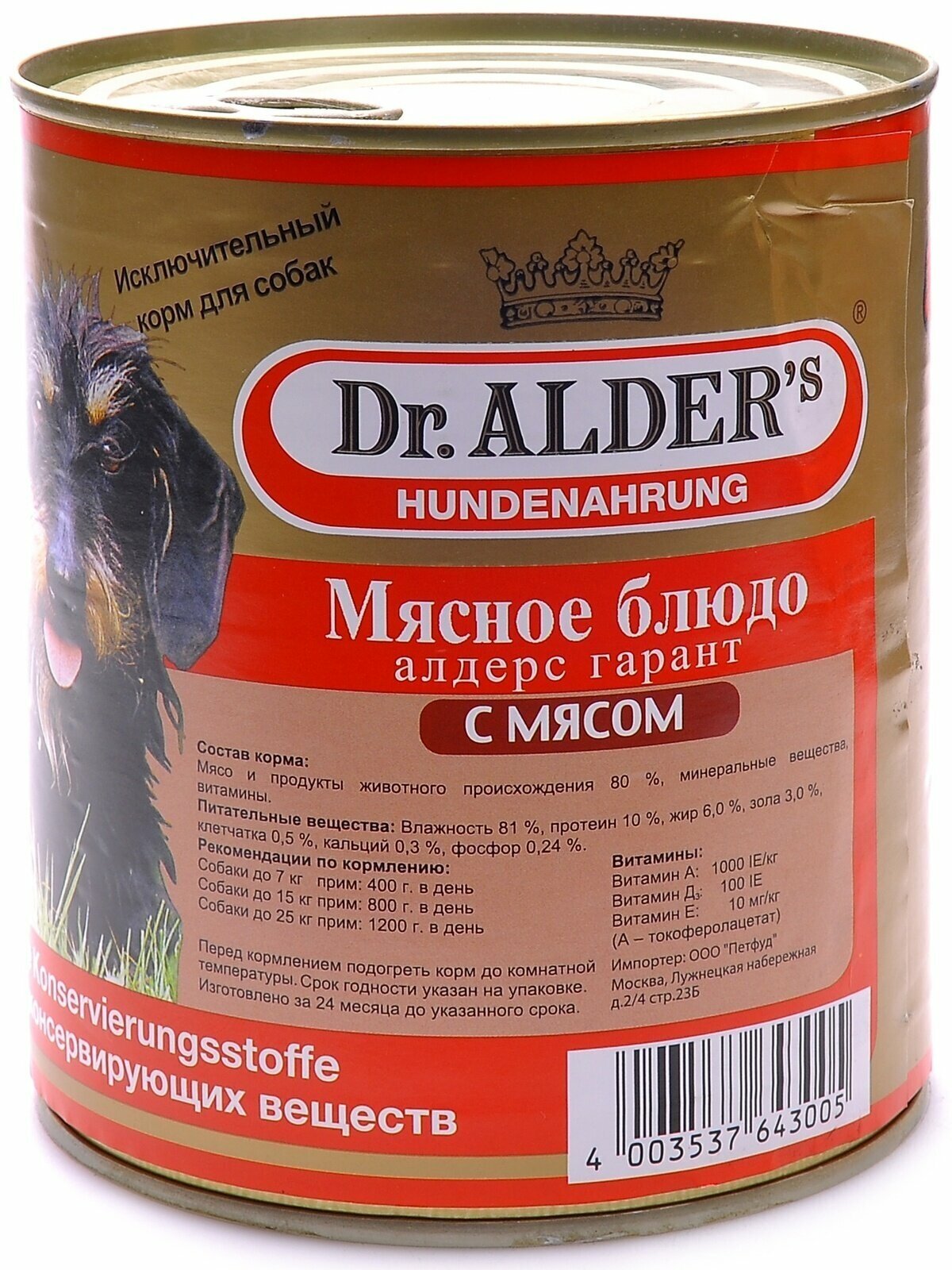 Лучшие цены. Корм для собак Dr. Alder's «Мясное блюдо» из говядины. Без консервирующих веществ. Содержит минеральные вещества и витамины, на 80 % состоит из мяса и продуктов животного происхождения. Имеет в составе витамин А 1000 IE/кг, витамин Д 100 IE/кг, витамин Е 10 мг/кг. Рекомендации по кормлению: собаки до 7 кг — 400 г в день, собаки до 15 кг — 800г в день, собаки до 25 кг — 1200 г в день. Магазины в вашем городе.