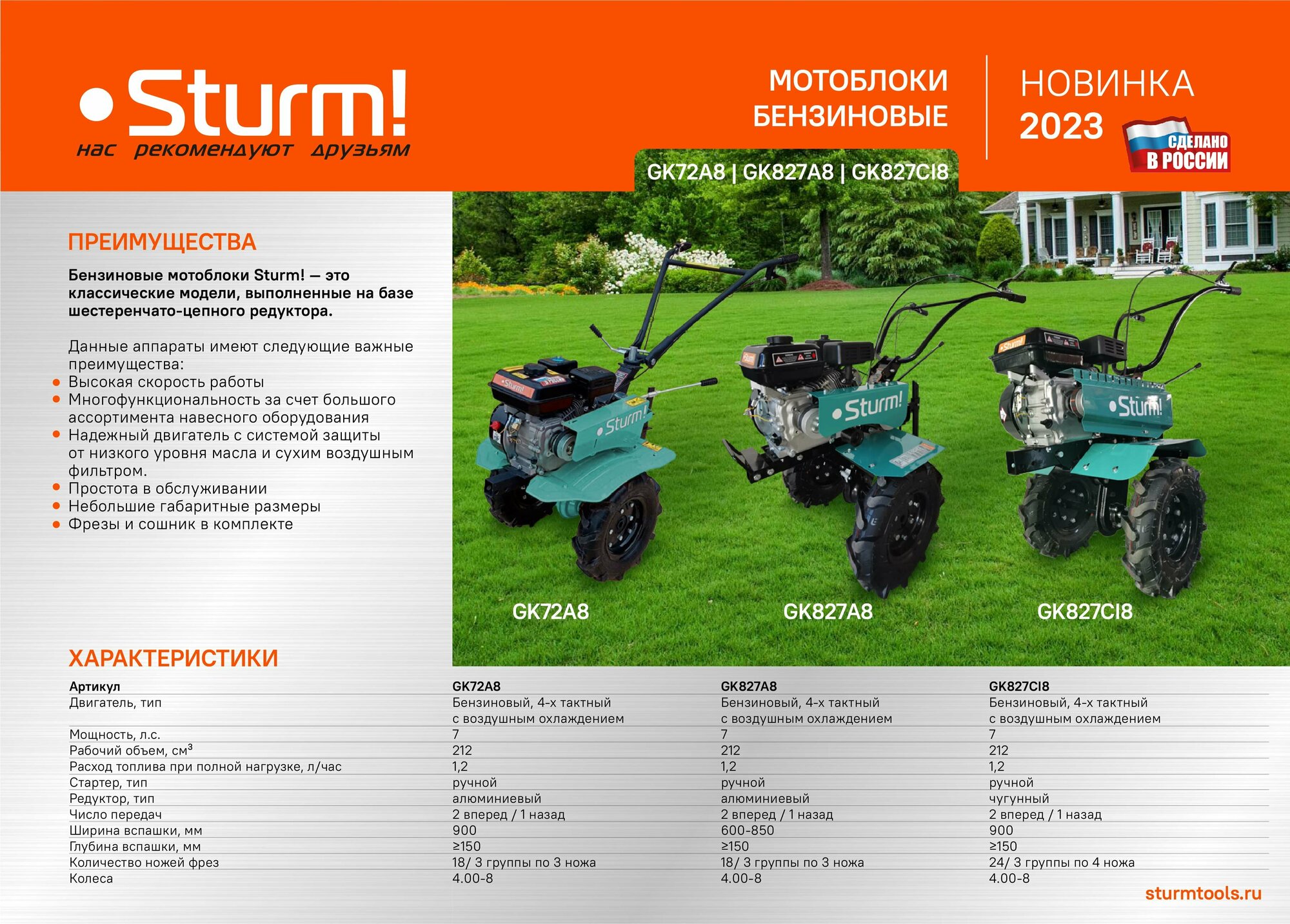 Лучшие цены. Мотоблок бензиновый Sturm! GK827CI8 — классическая модель с чугунным редуктором и формованными крыльями. Комплектуется колесами, фрезами, универсальной задней сцепкой, сошником, кронштейном передней навески. Магазины в вашем городе.
