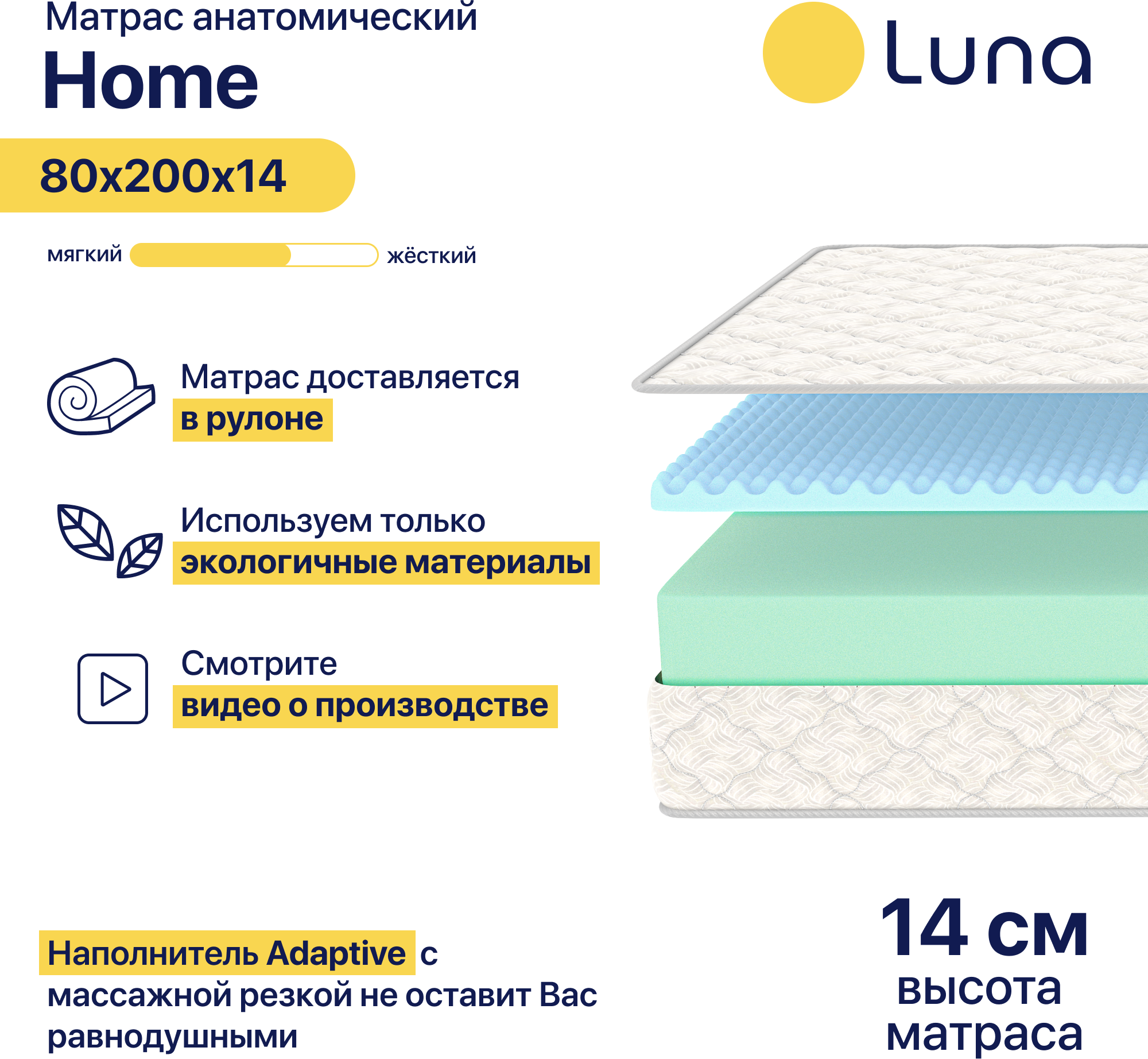 Матрасы Матрас ортопедический Luna Home 80х200 см беспружинный, двухсторонний, гипоаллергенный, анатомический, высота 14 см