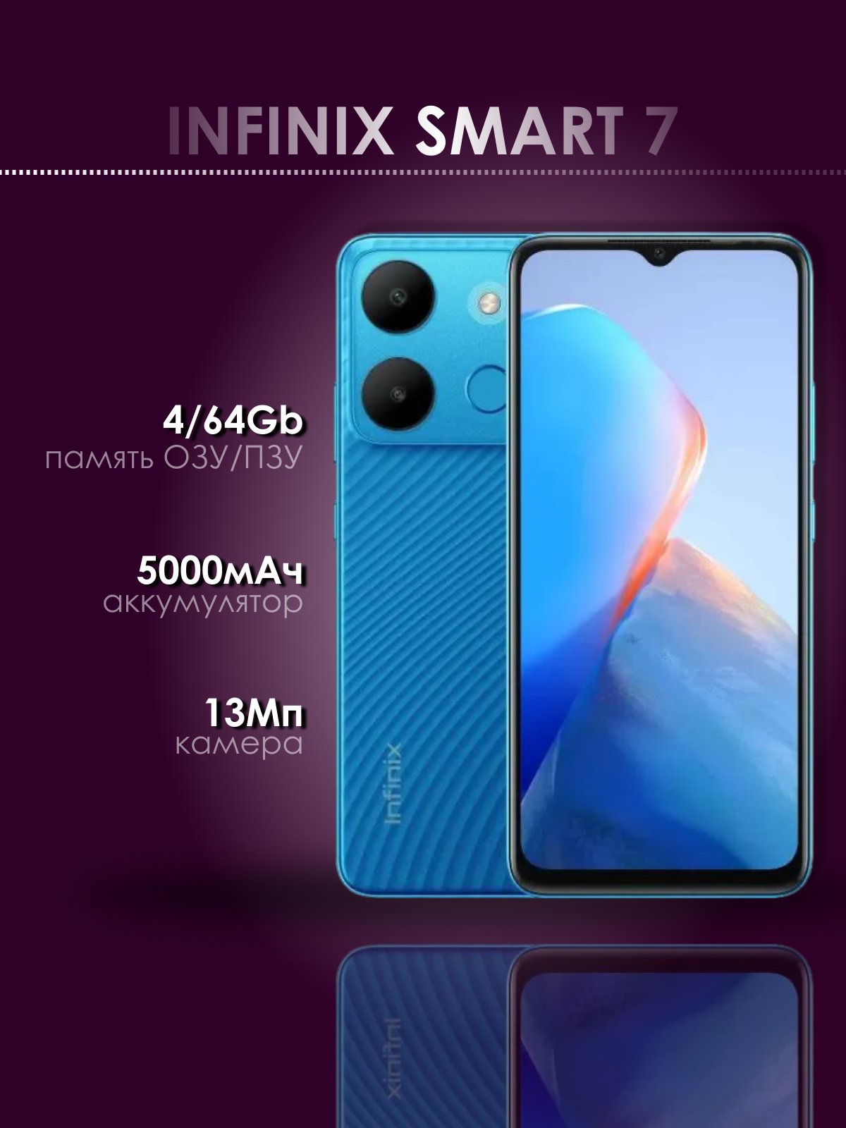Мобильный телефон Infinix Smart 7 4/64GB Peacock Blue/Синий 6 490 ₽ Подробнее