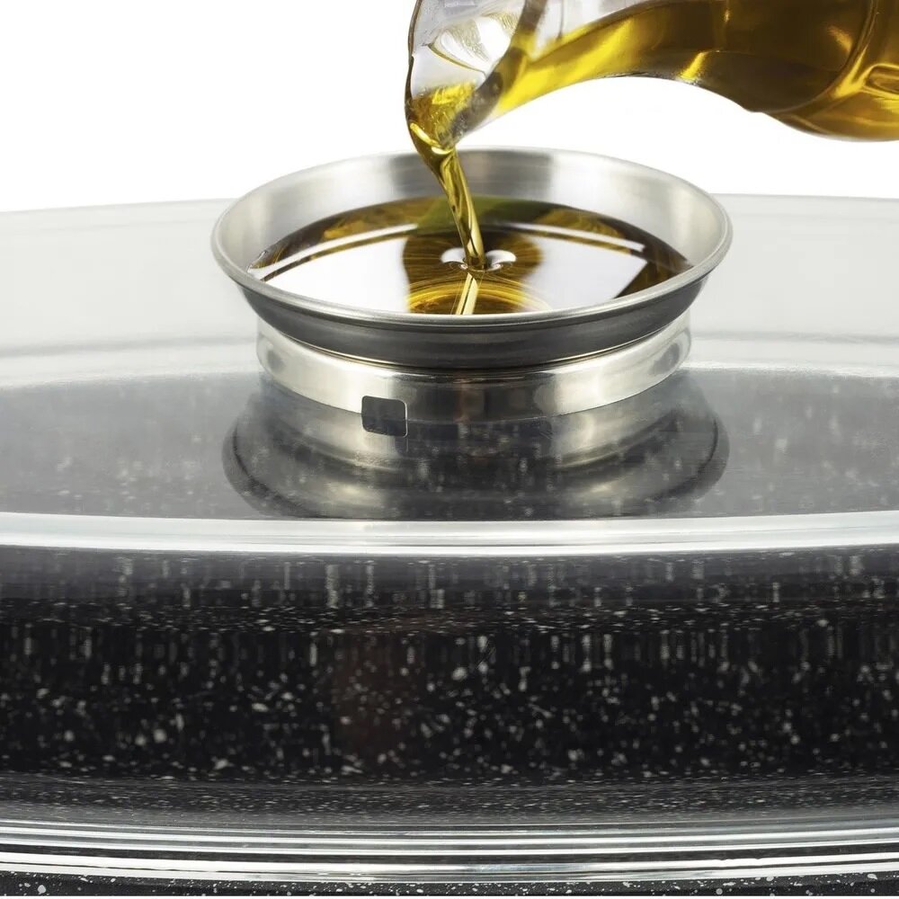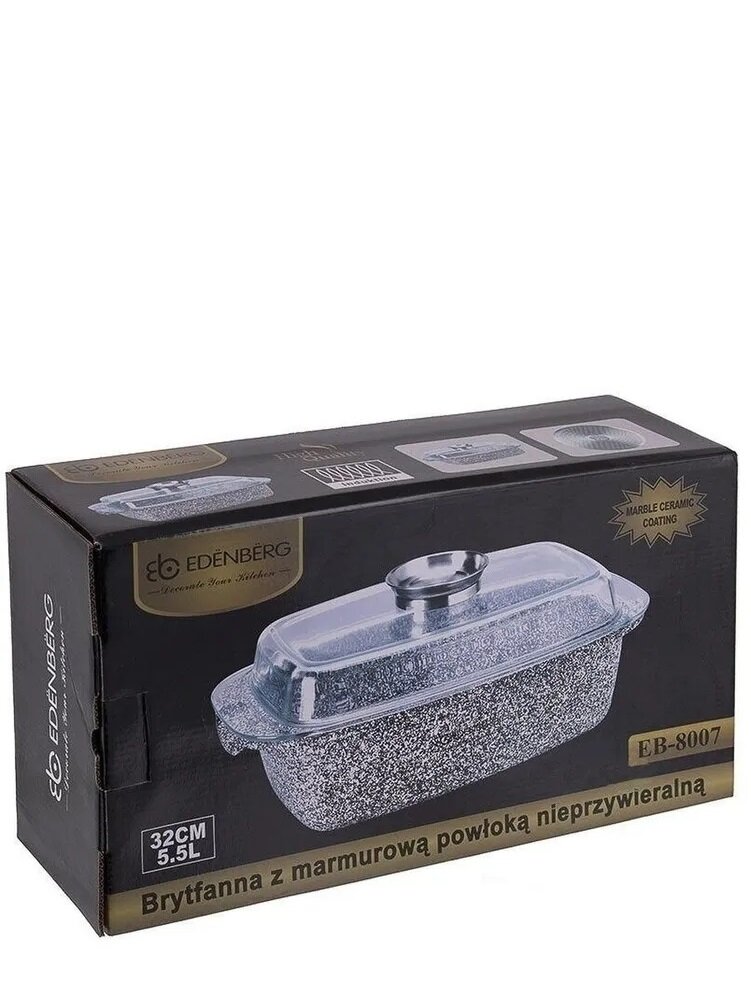 Лучшие цены. Удобная, практичная овальная гусятница Edenberg изготовлена из высококачественного алюминия и имеет антипригарное покрытие, крышку из жаропрочного стекла с отверстием для выхода пара. Оснащена ручкой на крышке которая специально предназначена для растительного масла. Вы просто наливаете в нее масло, через маленькое отверстие масло постепенно капает на мясо, что придаст аппетитную корочку. Овальная гусятница Edenberg легко моется в посудомоечной машине. Полезный объем жаровни- 4,5л. Магазины в вашем городе.