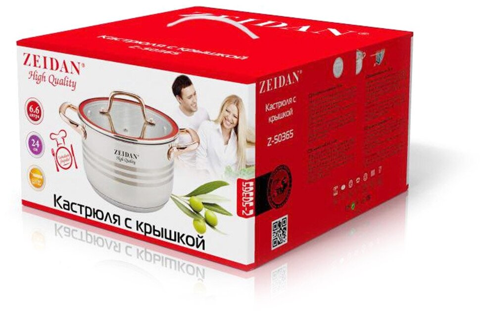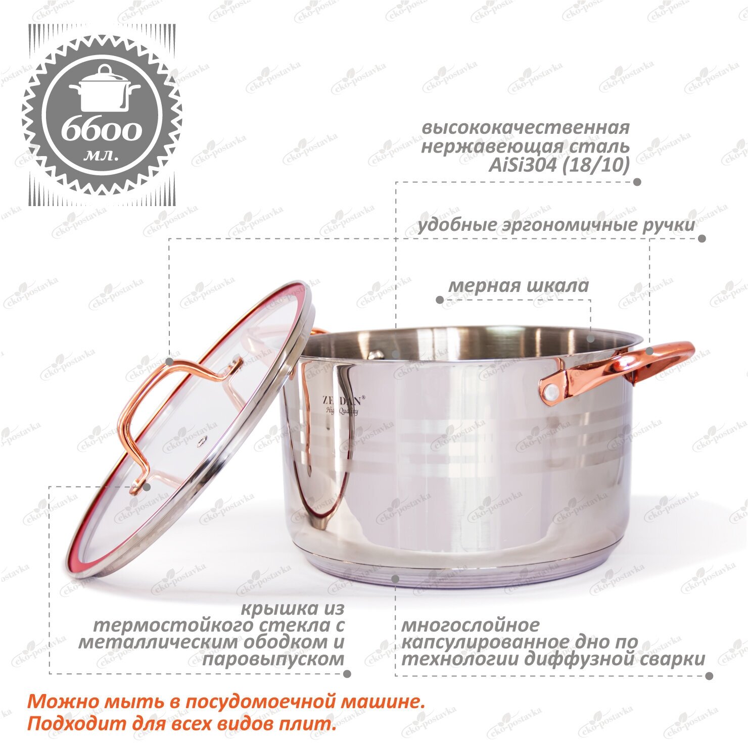 Лучшие цены. Кастрюля Zeidan Z-50365 диаметром 24 см, объемом 6,6 литра - изготовлена из высококачественной нержавеющей стали, чрезвычайно устойчива к коррозии и надолго сохраняет свои функциональные свойства. 5-ти степовое капсулированное дно позволяет готовить с минимальным количеством воды и жира, или же совсем без них. Комбинированная полировка снаружи, матовая полировка внутри, стеклянная крышка с декоративным кантом, ручки "под золото". Подходит для всех видов плит, включая индукционную. Магазины в вашем городе.