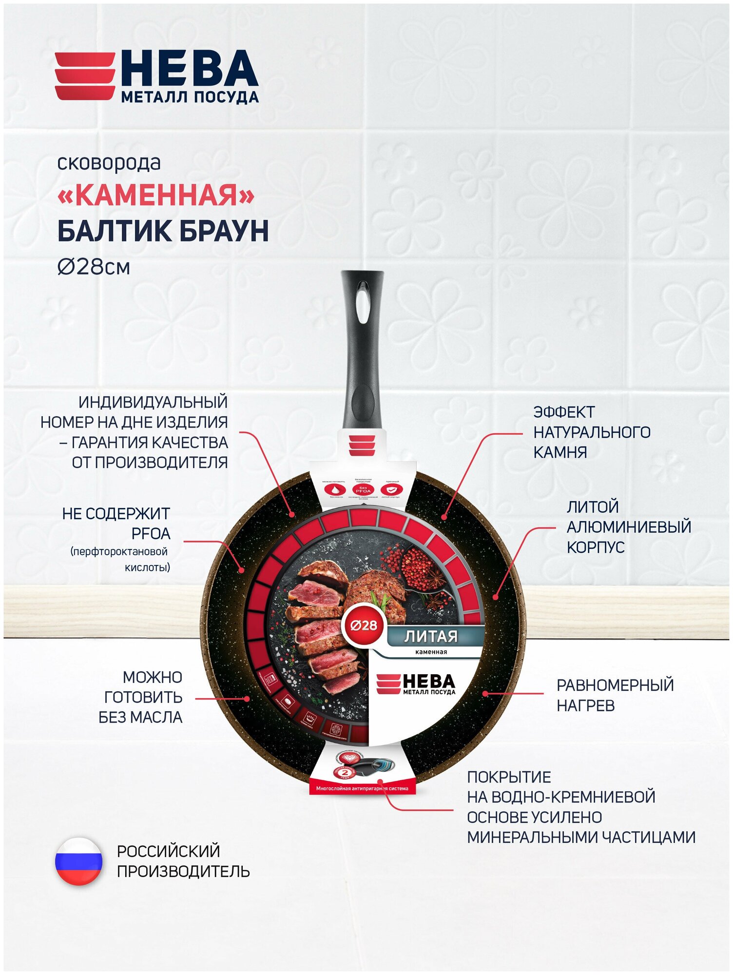 Сковородка Сковорода Нева металл посуда Балтик Браун 17128, 28см, без крышки, коричневый