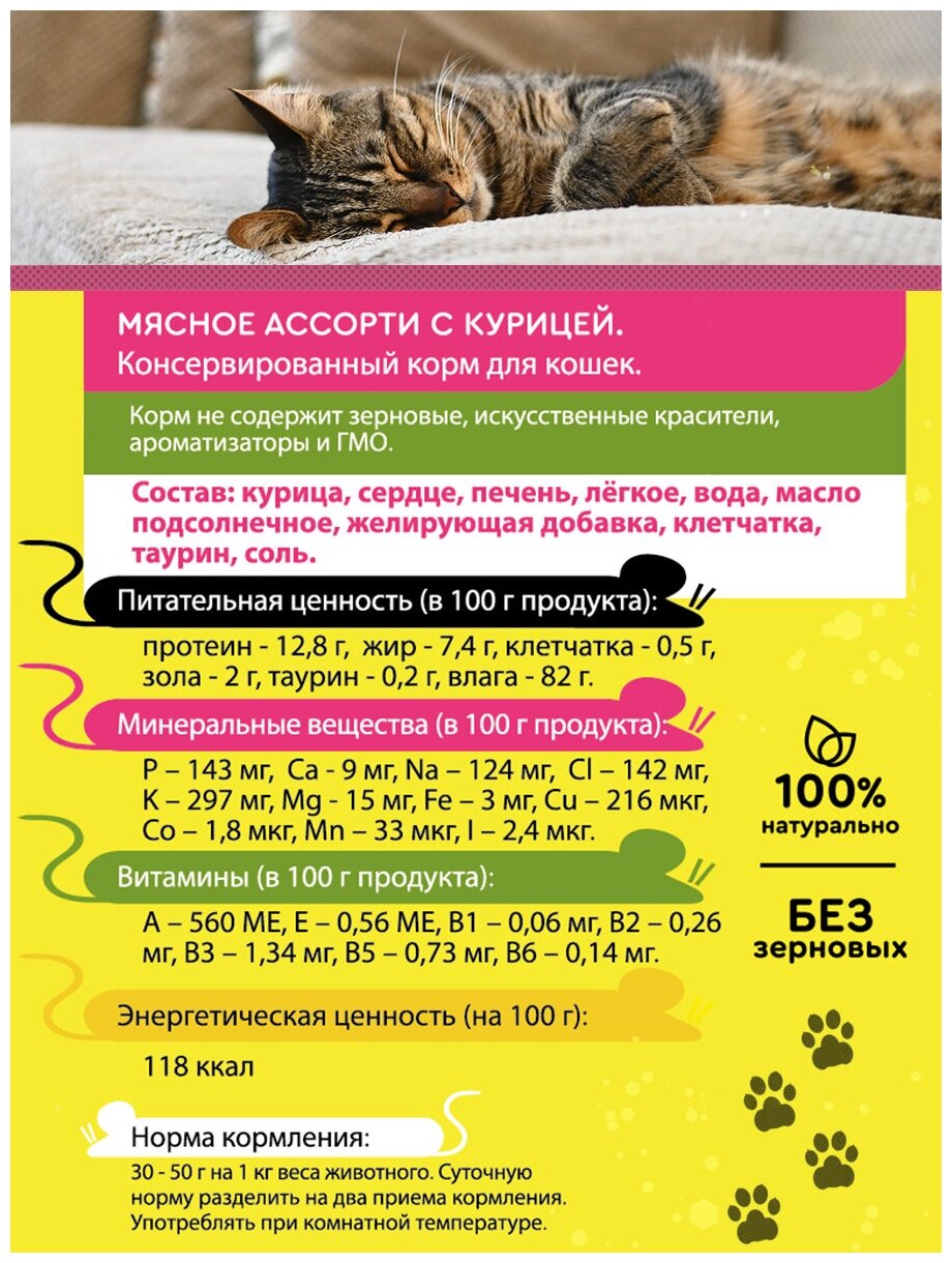 Лучшие цены. Вкусмясина - это корм, приготовленный с учетом потребностей и предпочтений животных. В его рецептуре самые вкусные и лакомые для кошек мясные компоненты. Корм полностью натуральный. Он подходит для кошек всех пород и обеспечивает питомцам необходимые жизненные силы и энергию! Не содержит сою, искусственные красители, консерванты и ГМО. Вкусмясина - только самое вкусное и полезное для ваших мурчащих любимцев. Магазины в вашем городе.