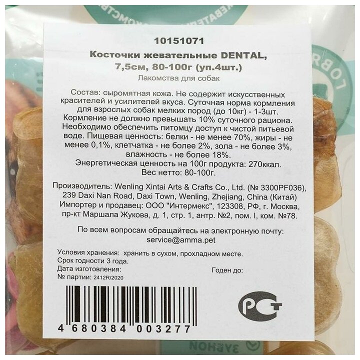Лучшие цены. Косточки жевательные DENTAL, изготовленные из сыромятной кожи, прекрасно очищают межзубное пространство, предотвращают образование зубного камня, тренируют челюстные мышцы, привлекают внимание собаки на долгое время, что значительно снижает риск порчи предметов мебели и личных вещей хозяина. Не содержит искусственных красителей и усилителей вкуса. Кормление не должно превышать 10 % суточного рациона. Необходимо обеспечить питомцу доступ к чистой питьевой воде. Магазины в вашем городе.