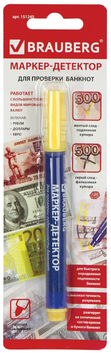 Лучшие цены. Маркер-детектор BRAUBERG предназначен для быстрой проверки подлинности банкнот. Используется как работниками в финансовой сфере, так и обычными людьми, которые периодически снимают деньги с банкоматов. Реагирует на химический состав краски и бумаги банкнот. Работает с большинством видов мировых валют: рубли, доллары, евро. Имеет круглый наконечник и увеличенный объем чернил. способ применения На проверяемую банкноту необходимо нанести любую метку маркером. Магазины в вашем городе.