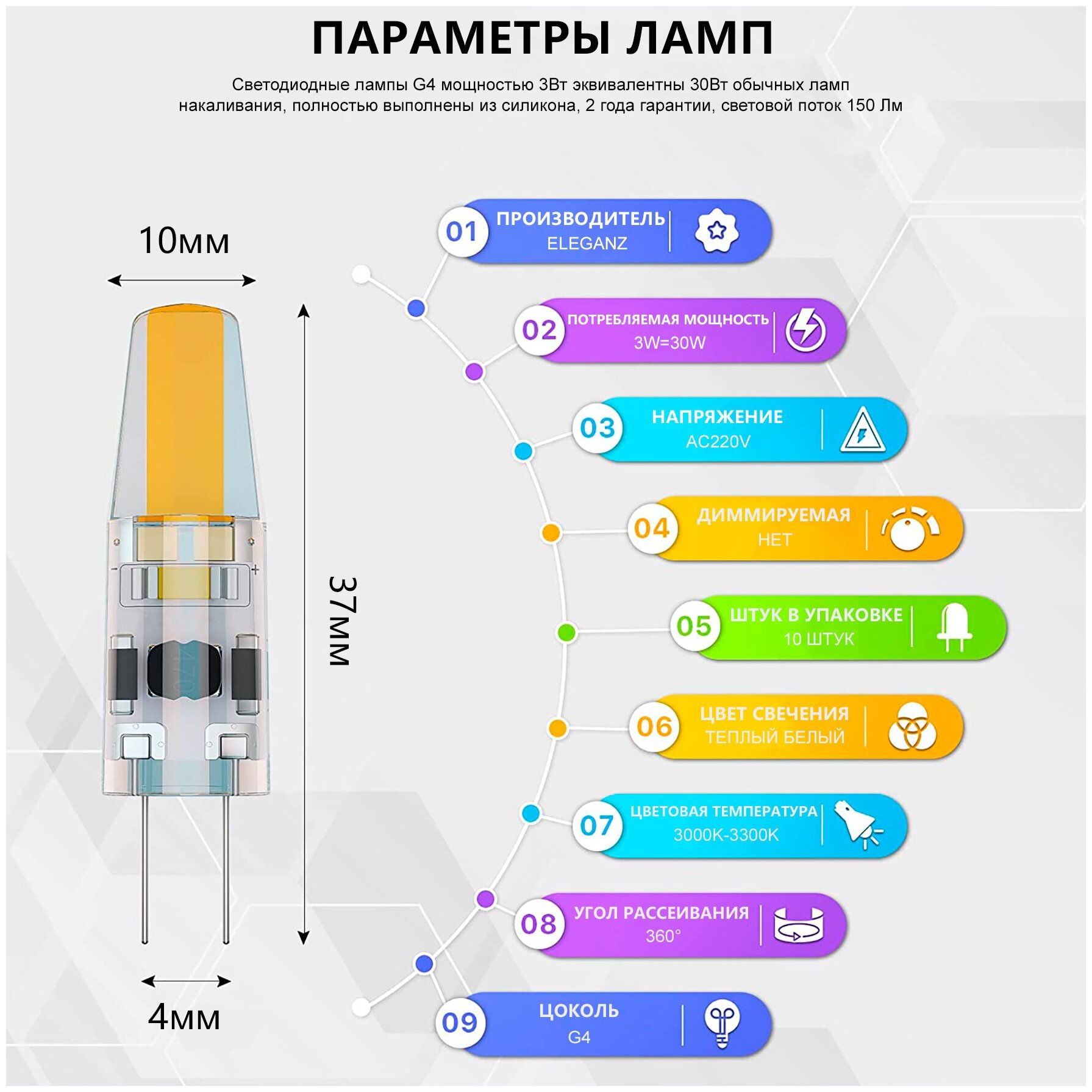 Лампочки Комплект светодиодных ламп Eleganz G4 220В 3Вт 3000K 10штук