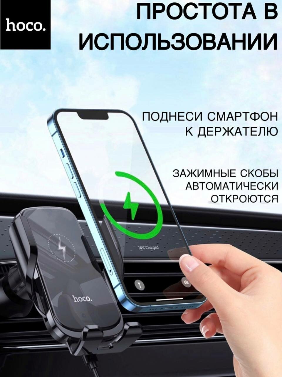 Держатель для телефона автомобильный автоматический в машину на воздуховод Hoco CA202 с беспроводной зарядкой 15W для iPhone, Android, цвет черный