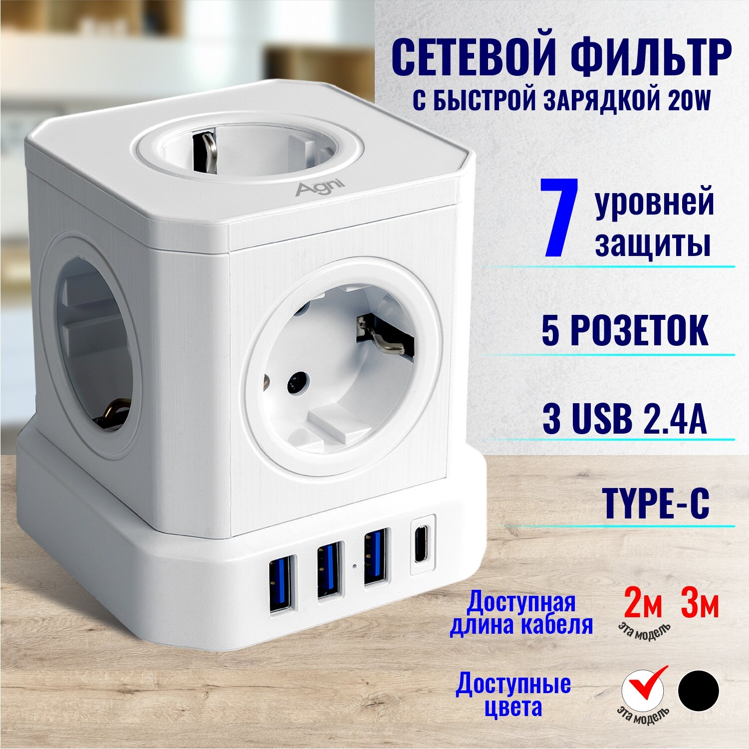 Сетевые фильтры и удлинители Сетевой фильтр с предохранителем и заземлением AGNI 5 розеток 220V, 3 USB 2.4A, 1 TYPE-C 20W (быстрая зарядка), 16A / 4000Вт 2м белый