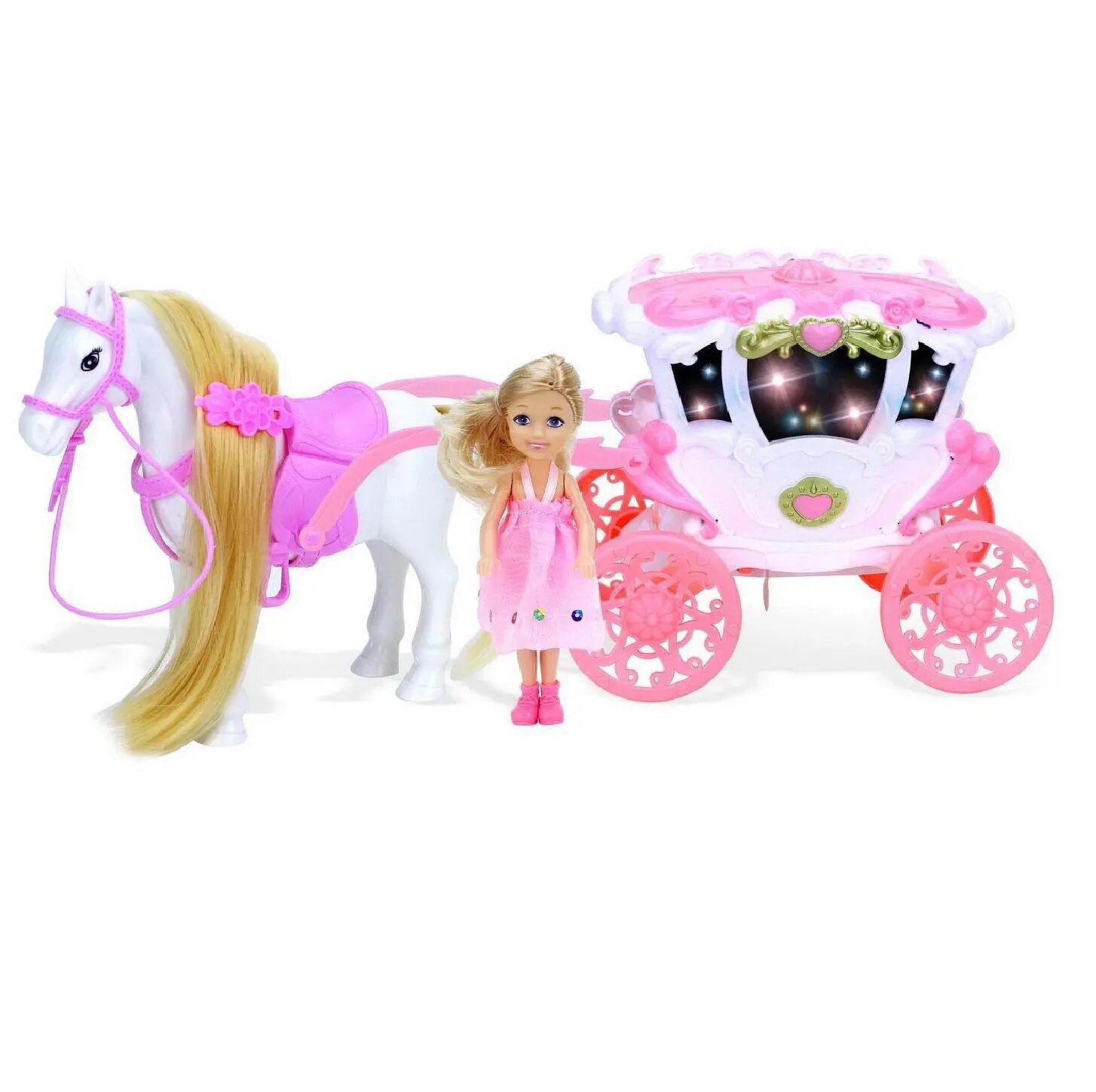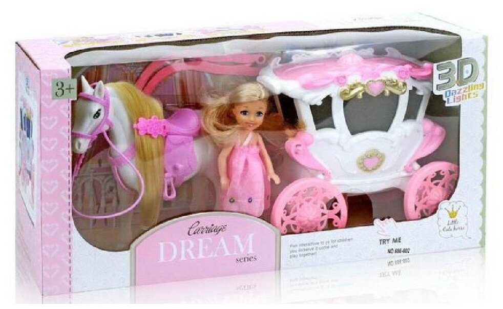 Лошадка в наборе с бело-розовой каретой и куколкой, со световыми и звуковыми эффектами, в коробке 38х12,5х19см