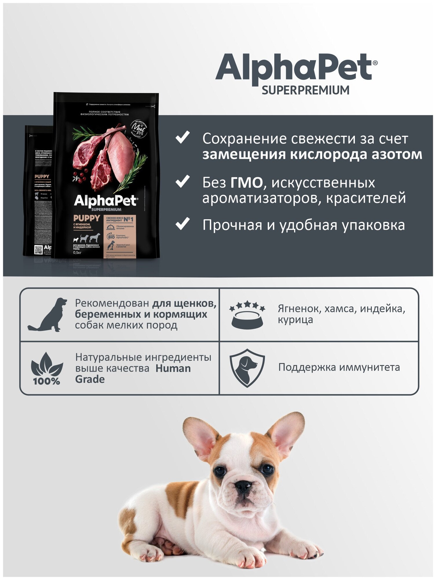 ALPHAPET SUPERPREMIUM PUPPY для щенков, беременных и кормящих собак маленьких пород с ягненком и индейкой (1,5 кг)