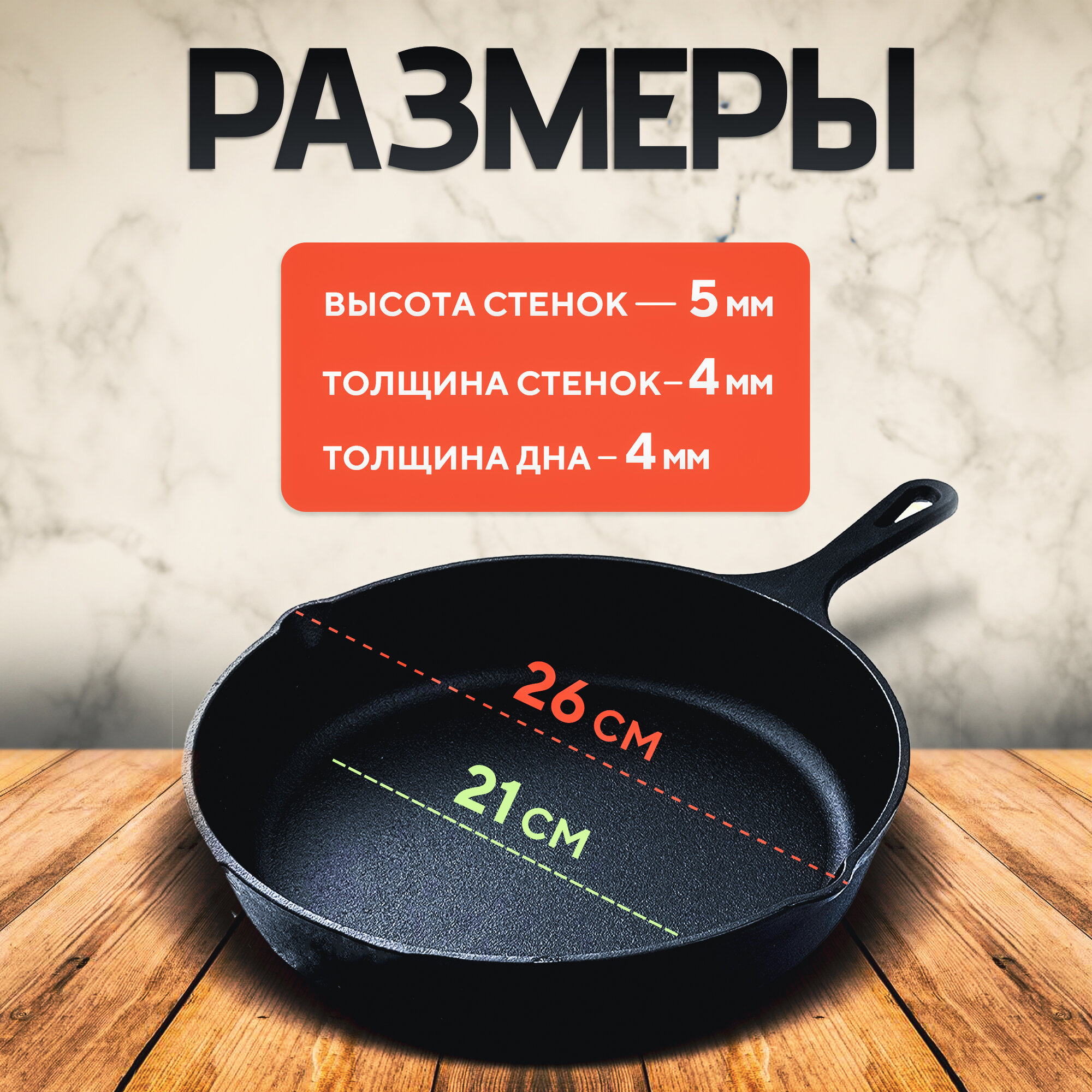 Сковородки Сковорода чугунная ø - 26 см, цельнолитая с носиками для масла, толщина дна - 4 мм
