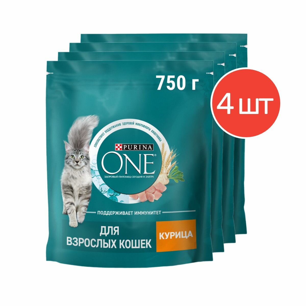 Корм для кошек Сухой корм Purina ONE для взрослых кошек с курицей и цельным злаками 750 г, 4 шт
