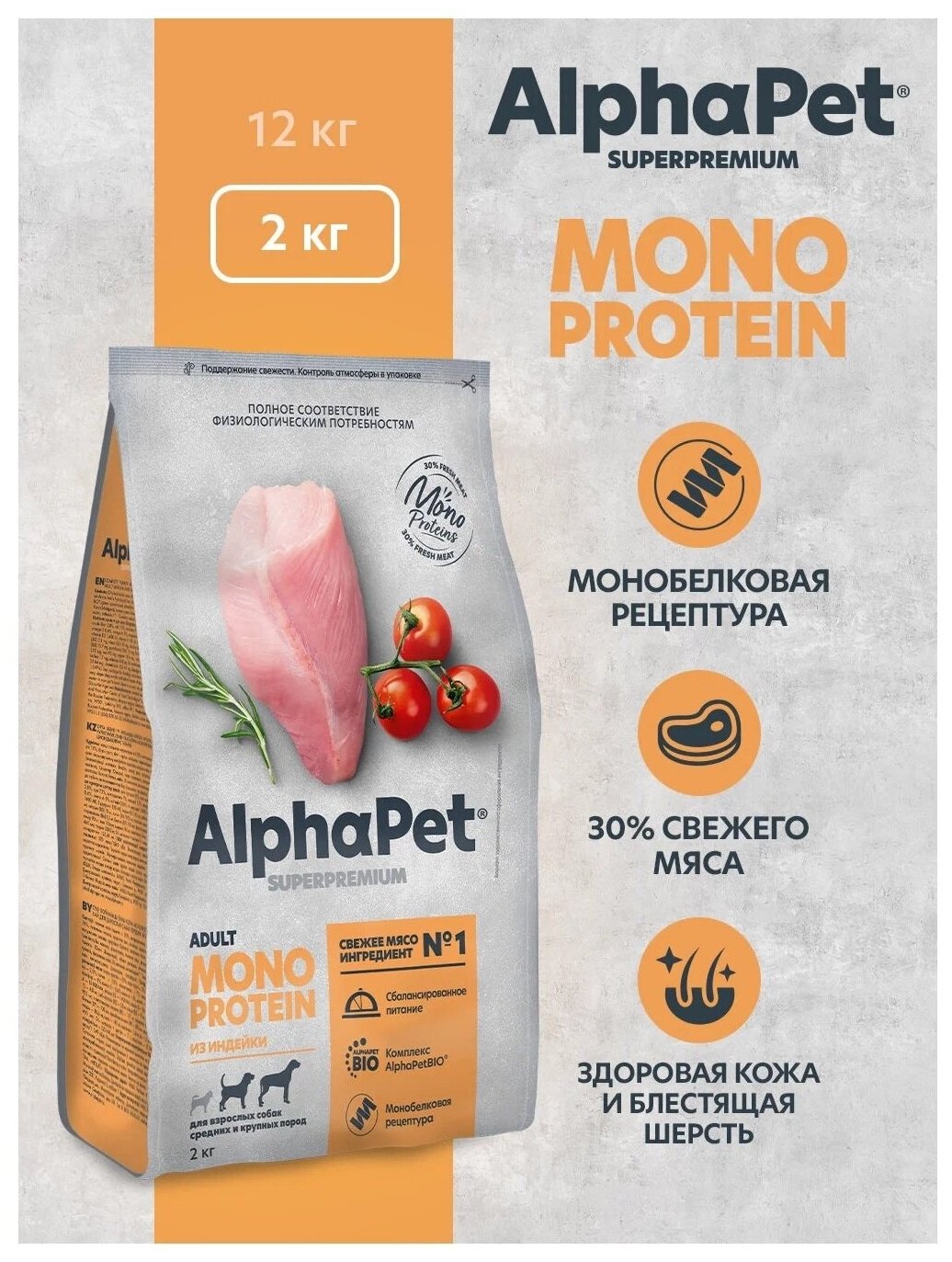 Корм для собак ALPHAPET MONOPROTEIN сухой корм для взрослых собак средних и крупных пород из Индейки 2кг