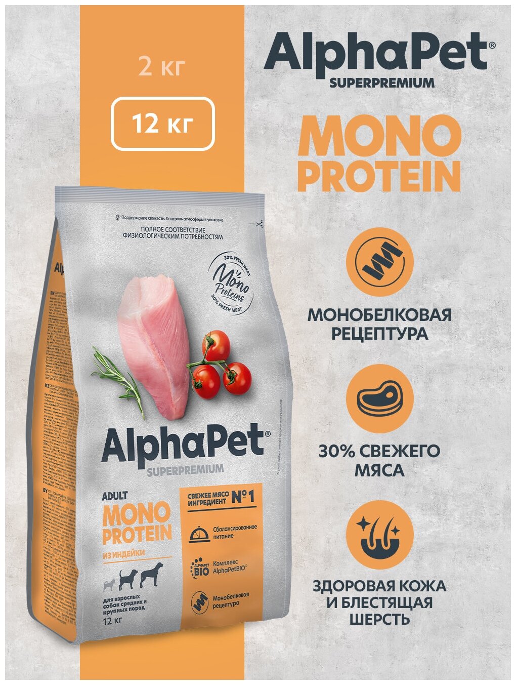 Лучшие цены. Сухой полнорационный монобелковый корм AlphaPet Superpremium Monoprotein для взрослых собак средних и крупных пород с индейкой. AlphaРet Monoprotein - возможность кормить питомца высокомясным, сбалансированным рационом с простым и понятным составом, на основе только одного источника белка животного происхождения. Корм подойдет в качестве исключающей диеты. Ключевые особенности: Монобелковая рецептура. 30 %свежего мяса в составе. Поддержание здоровья кожи и блеска шерсти. Магазины в вашем городе.