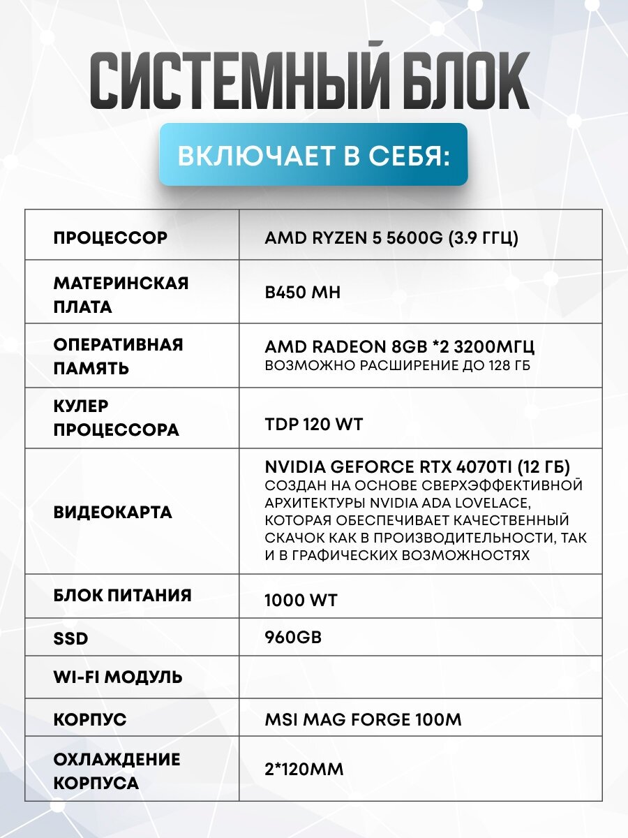 Персональные компьютеры Системный блок AMD RCR4070 (AMD Ryzen 5 5600G (3.9 ГГц), RAM 16 ГБ, SSD 960 ГБ, NVIDIA GeForce RTX 4070 Ti (12 ГБ), Windows 10 Home)