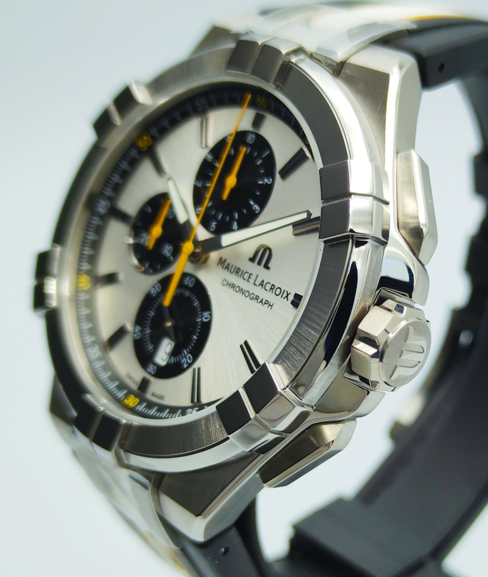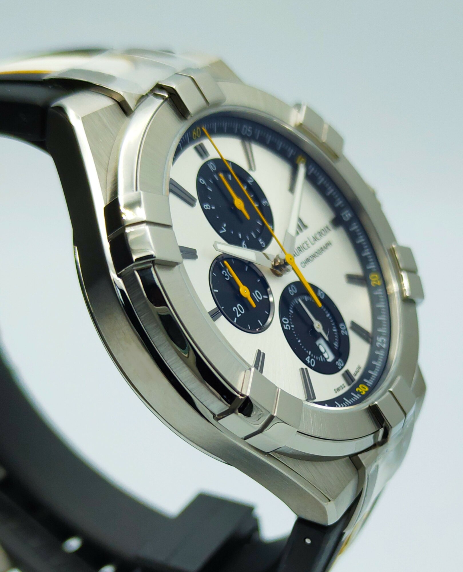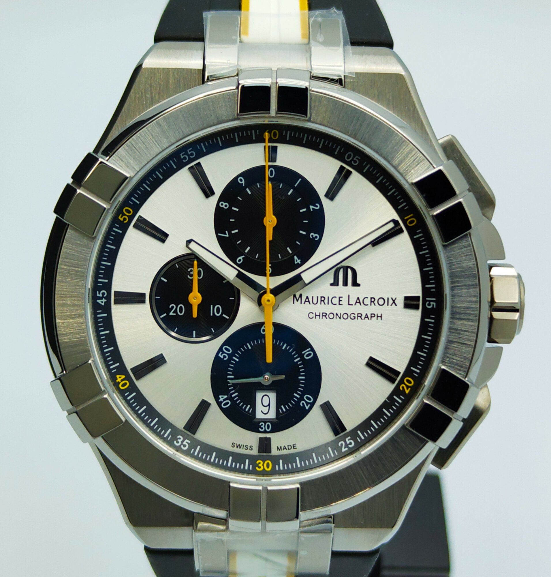 Лучшие цены. Эти часы из коллекции Maurice Lacroix Aikon - прекрасный выбор для тех, кто ищет часы с красивым дизайном и надежной функциональностью. Они имеют титановый корпус, который обеспечивает высокую прочность и легкость, а также хронограф, который позволяет отслеживать время с точностью до миллисекунды. Особенности стиля и дизайна этой модели включают в себя яркие контрасты между серебристым и черным цветами на циферблате и браслете, а также привлекательные золотые детали. Магазины в вашем городе.