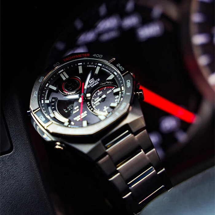 Лучшие цены. Мужские японские наручные часы Casio Edifice ECB-950DC-1A с хронографом. Элемент питания, солнечная батарейка, время работы без подзарядки 8 месяцев. Функция сохранения энергии позволяет увеличить время до 22 месяцев. Уровень заряда батарейки Вы всегда увидите благодаря наличию индикатора. Ударопрочная конструкция обеспечит защиту часов от ударов и вибрации. При недостаточном освещении поворот Вашей кисти включит яркую цветную подсветку. Магазины в вашем городе.