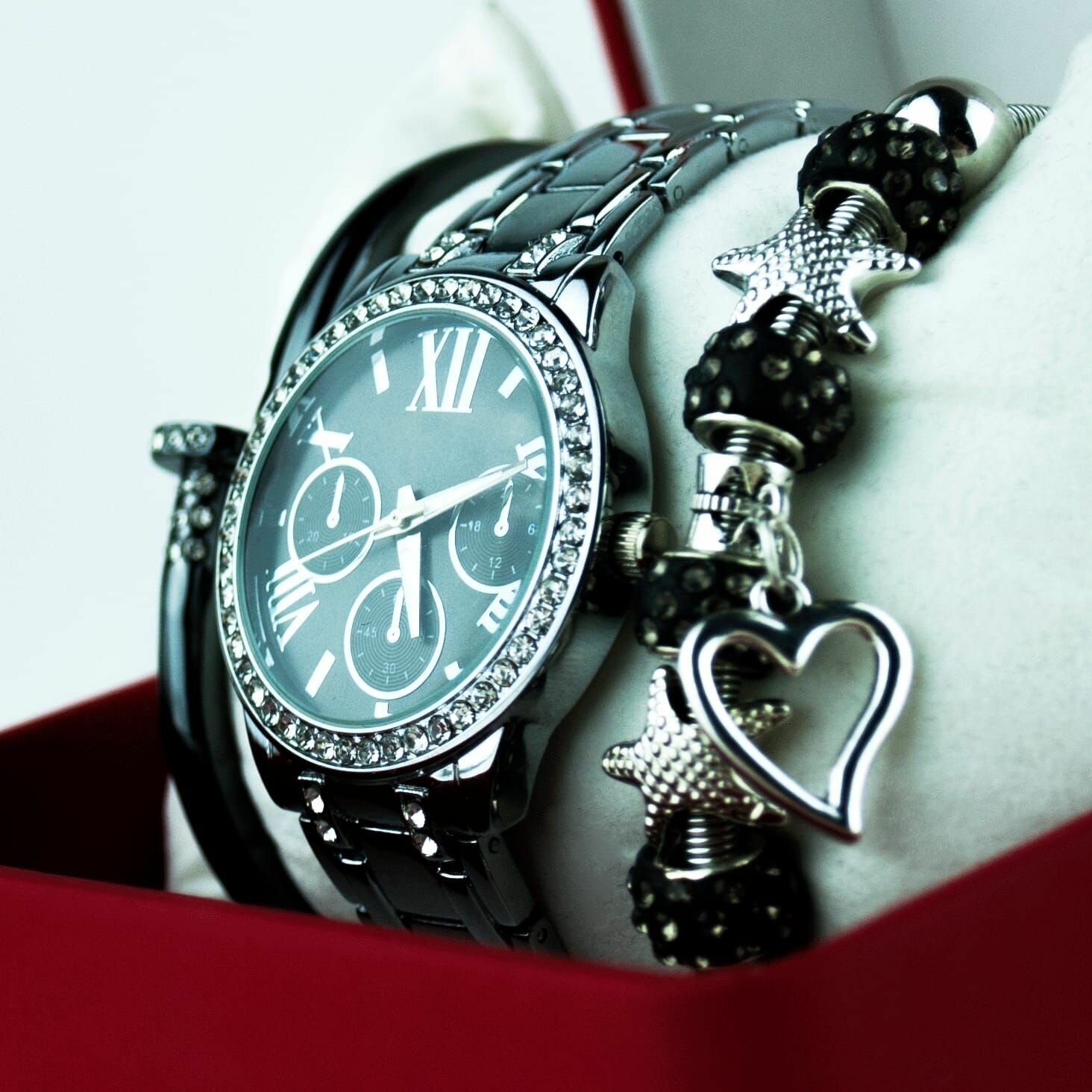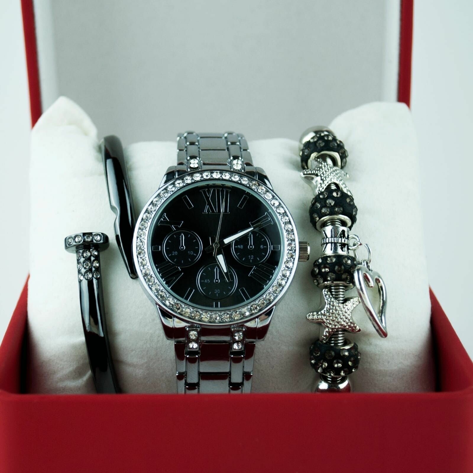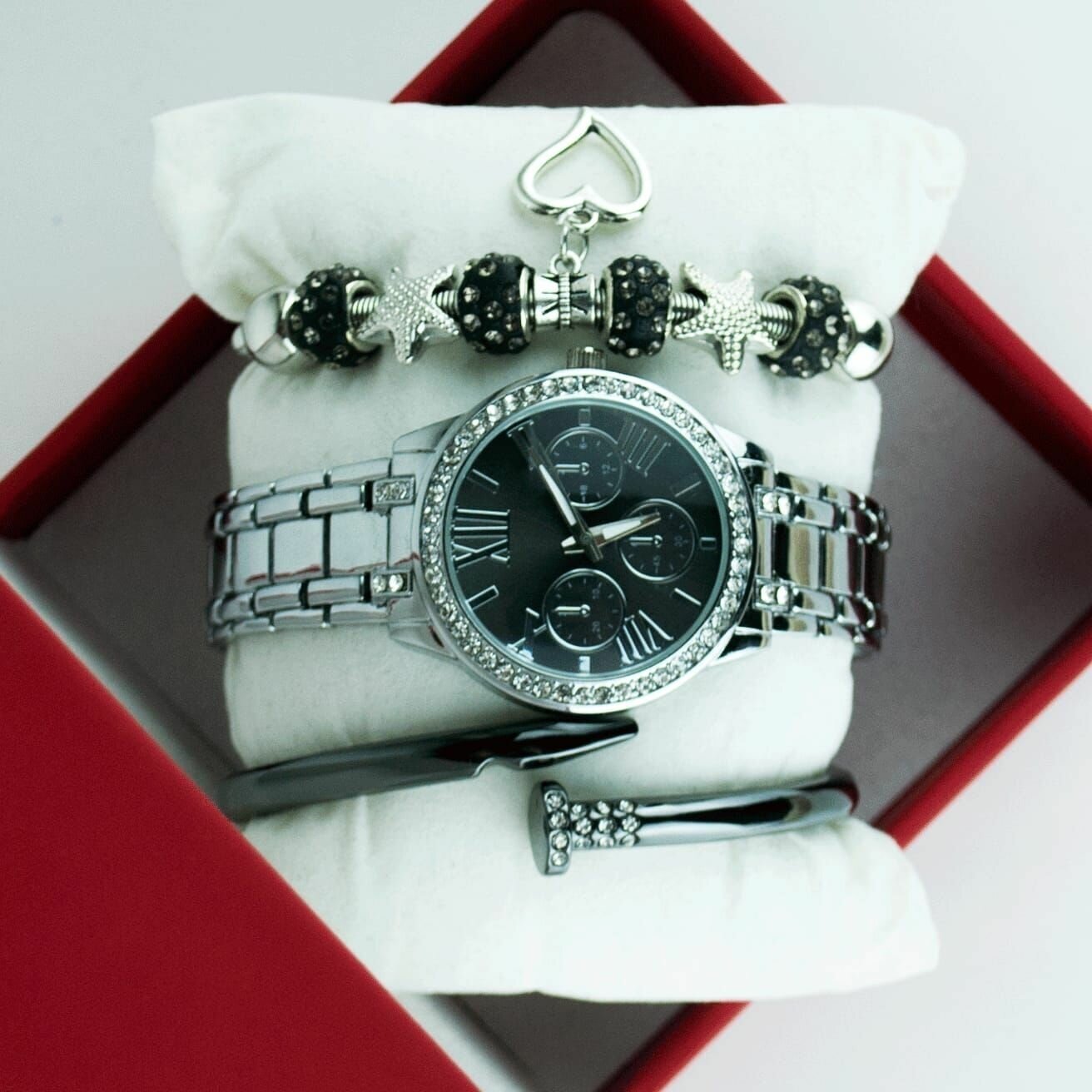 Наручные часы Подарочный набор женские наручные часы с двумя браслетами, серебро - черный
