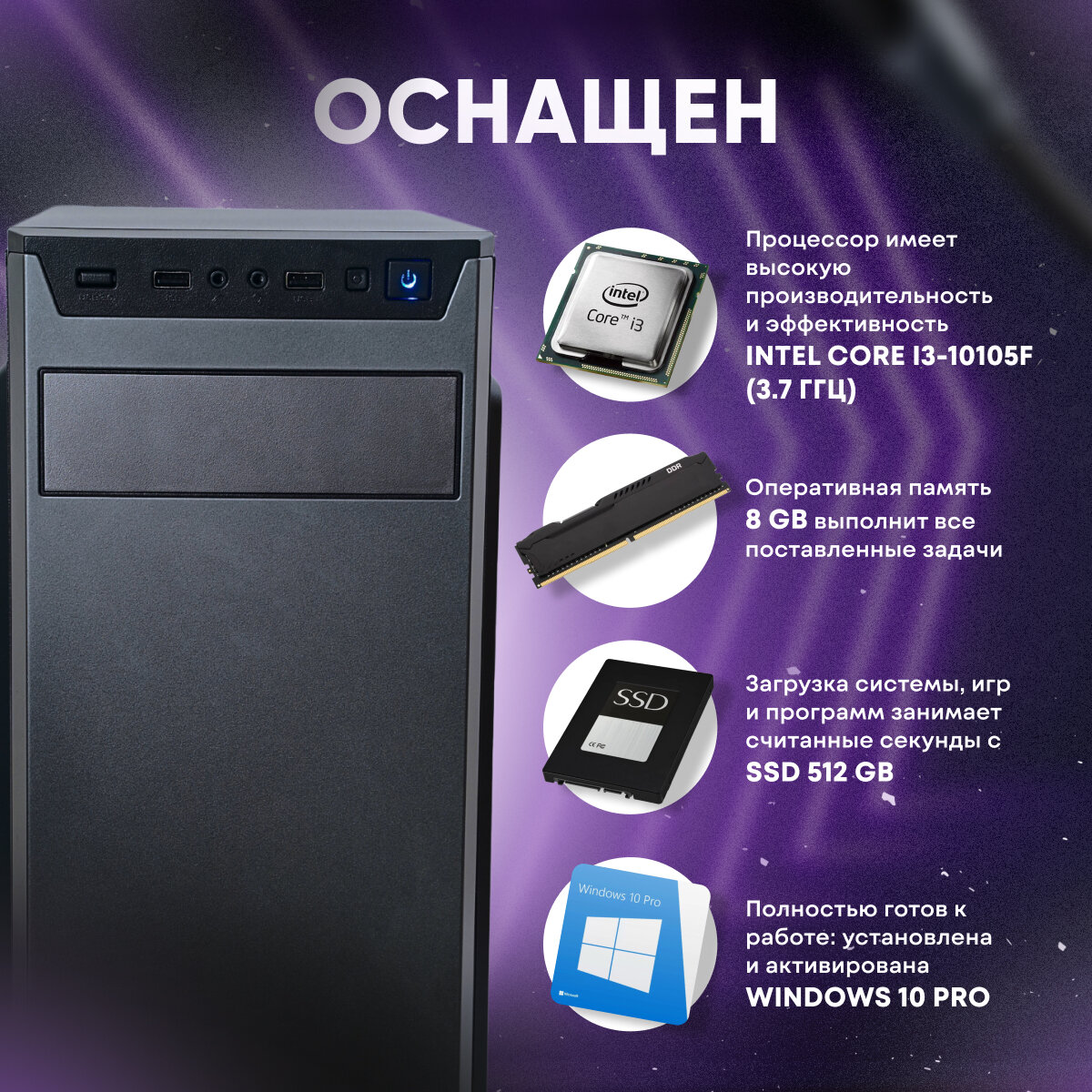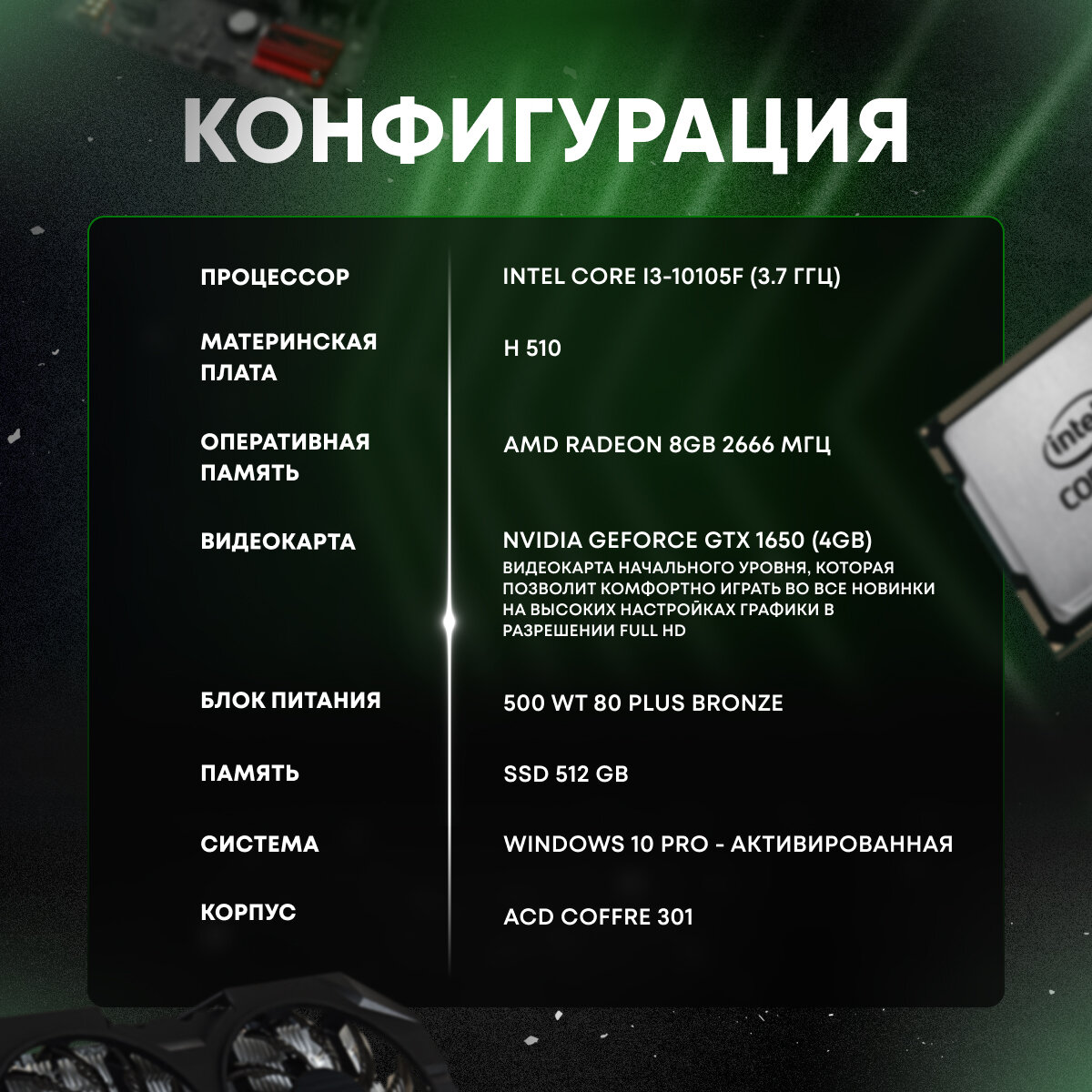 Лучшие цены. 1. Процессор - Intel core i3 10105F 2. Материнская плата - Gigabyte H410M H 3. Оперативная память -8GB DDR4 2666 XPG 4. Башенный куллер - ID Cooling 5. Блок питания - Aerocool 550 6. SSD - 512GB Amd radeon 7. Корпус - ACD Coffre 301 8. Видеокарта - GTX 1650 Gigabyte/Palit/Msi 10. Windows 10 Home 11. Гарантийный талон сроком 12 месяцев. Магазины в вашем городе.