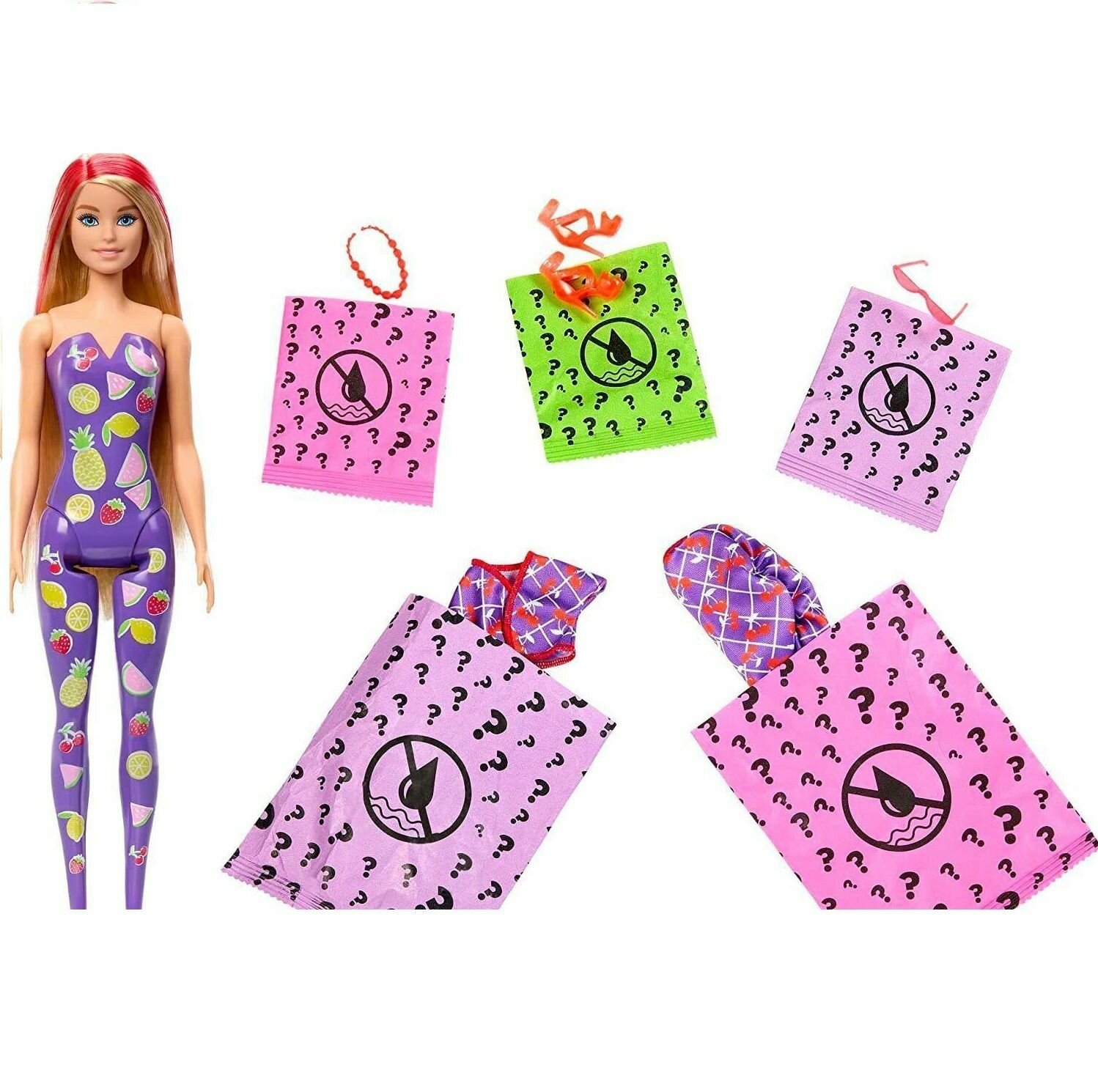 Лучшие цены. Зарядись фруктовым настроением с куклой Barbie Color Reveal! В упаковке вас ждёт яркая Барби с приятным ароматом, таинственным нарядом и сногсшибательными элементами образа. Внутри упаковки спряталась одна из 5 кукол серии. Какая именно, сюрприз! Эффект проявления в воде. Наполните упаковку-тубус тёплой водой, опустите туда куклу и потрясите, чтобы смыть её фруктовый наряд и проявить яркий топ. Дополните топ одеждой и аксессуарами, упакованными в секретные пакетики. Магазины в вашем городе.