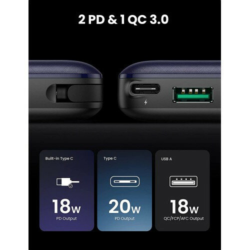 Powerbank Внешний аккумулятор UGREEN PB172 (80917) Power Bank PD 20W 10000mAh со встроенным кабелем USB-C тёмно-синий
