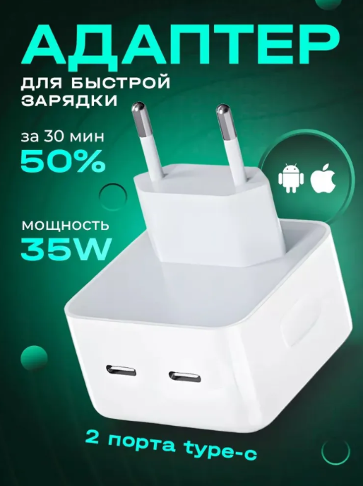 Зарядки для гаджетов Адаптер type C / Зарядка / Блок питания для телефона 35 W с двумя разъемами USB-C (TYPE C ) для iphone и андроид / Белый