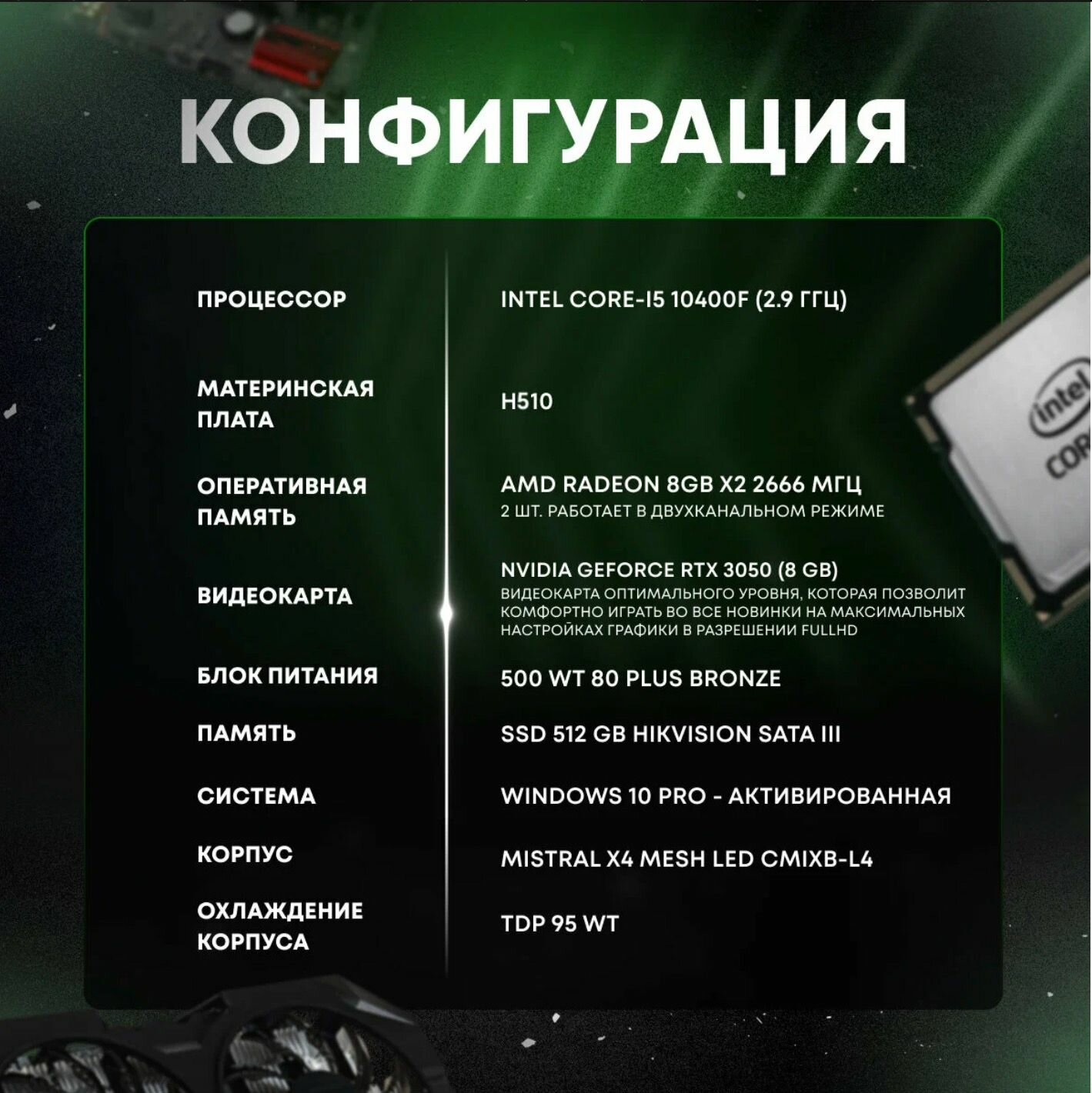 Персональные компьютеры Системный блок Intel Игровой компьютер (Intel Core-i5 10400f(2.9 ГГц), RAM 16 ГБ, SSD 512 TБ, NVIDIA GeForce RTX 3050 (8 Гб), Windows 10 Home) черный