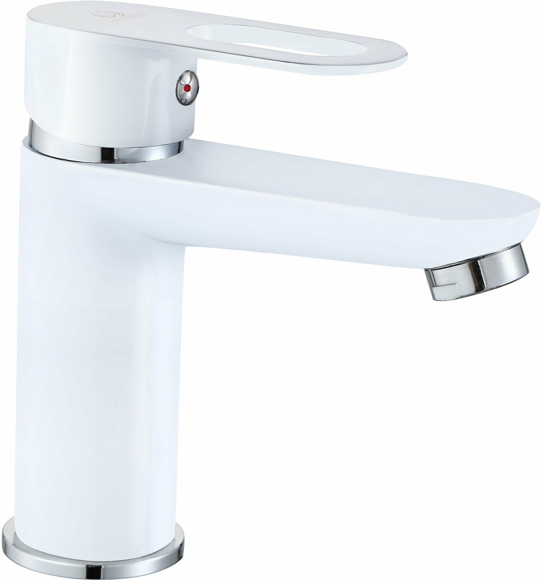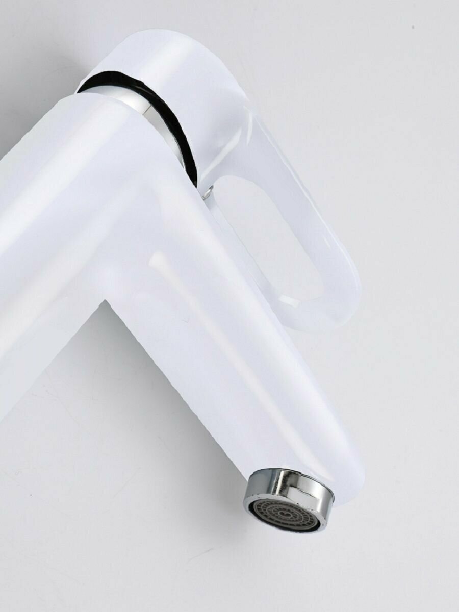 Смесители Смеситель для раковины/ для умывальника MYNAH белый, высота 144 мм, рычажное управление. Фиксированный излив. Монтаж на одно отверстие, на гайке. Гибкая подводка.