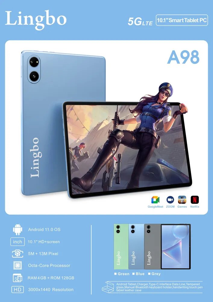 Планшеты Планшет Lingbo A98 , 10.1" LTE, 4GB 128GB, планшет андроид игровой со стилусом, Голубой