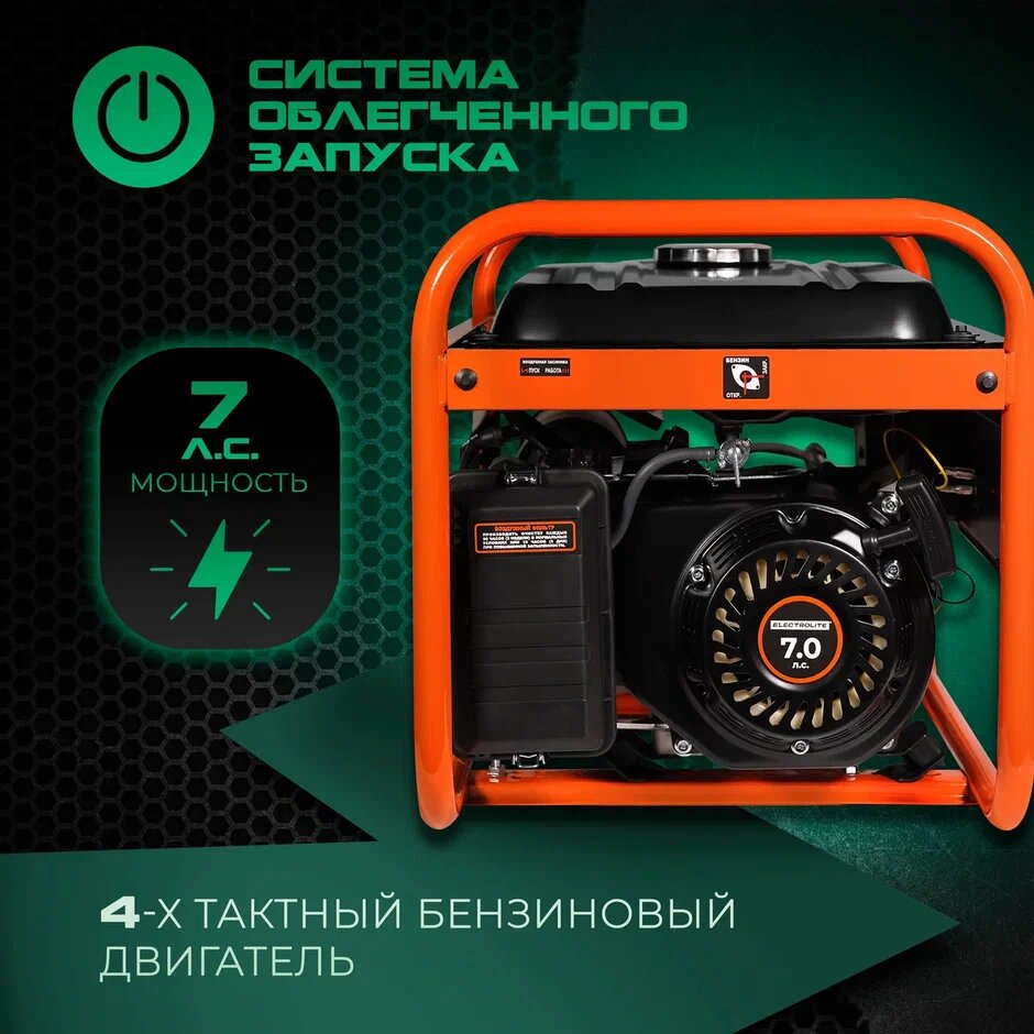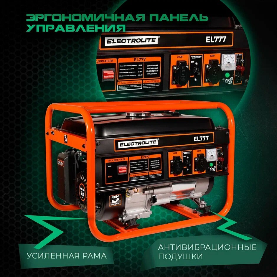 Генератор бензиновый / Бензогенератор / Портативная электростанция / Бензиновый генератор Electrolite 777 EL ( 4.875 кВа максимальная нагрузка , 220 В, 3 / 3.5 кВт, 7 л.с, ручной стартер ) 21 208 ₽ Подробнее