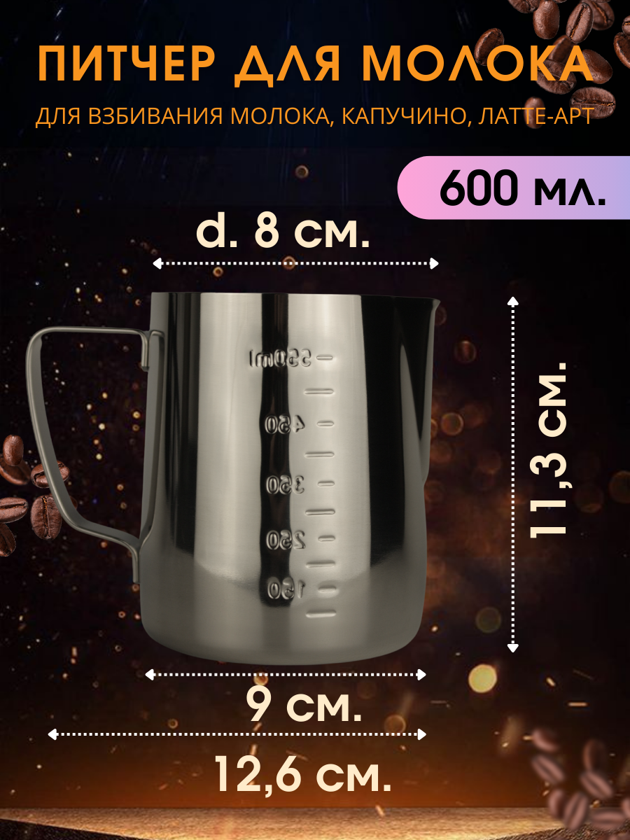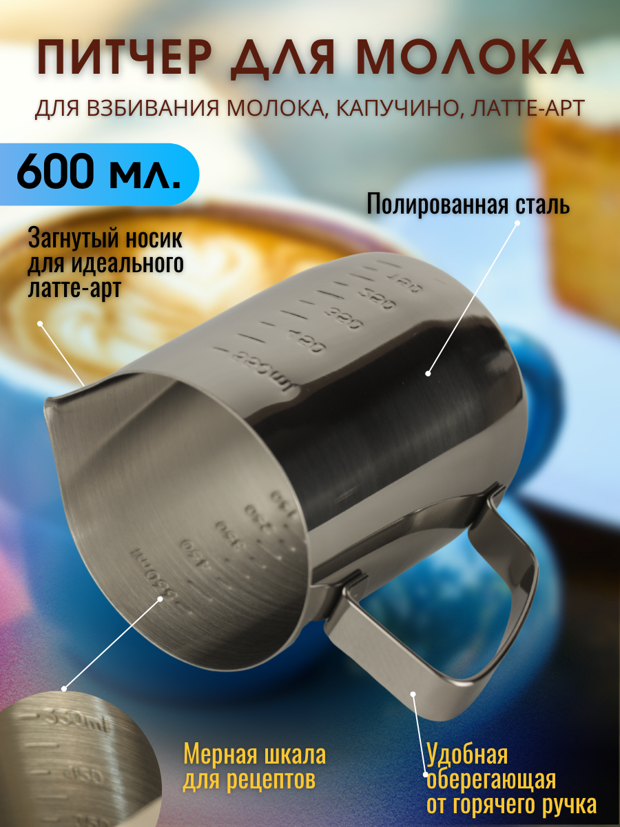 Кофеварки и кофемашины Питчер для молока 600 мл IlleChef с двойной шкалой молочник металлический для кофе, нержавеющая сталь