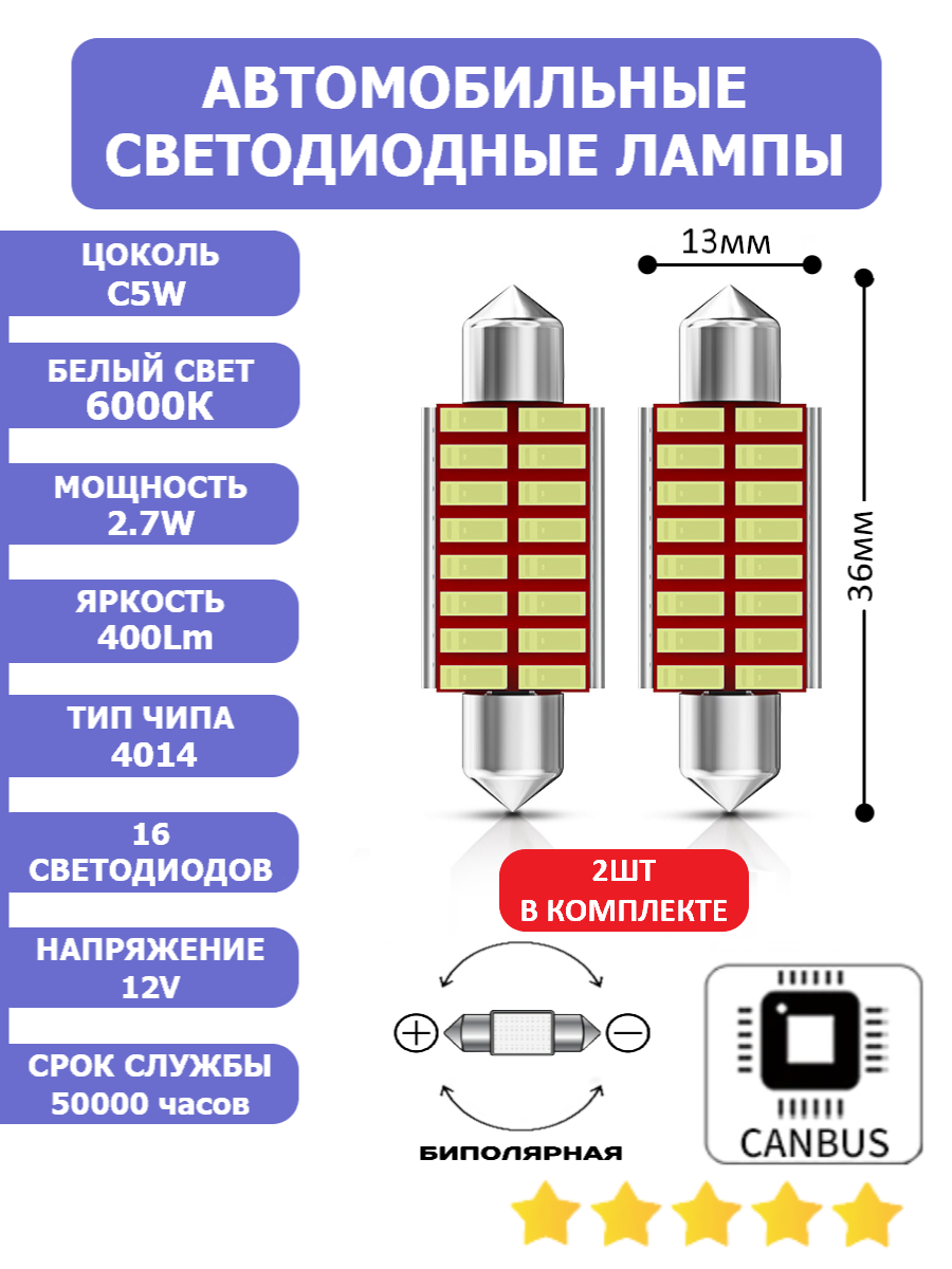 Автолампы Светодиодная LED лампа С5W, 36мм, 12V, с обманкой CANBUS, 2шт. в комплекте